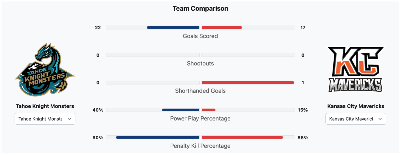 Both teams have four 2025 Kelly Cup Playoff wins. The Kansas City Mavericks have two more 2025 Kelly Cup Playoff losses. The Tahoe Knight Monsters have scored five more goals during the postseason. The Kansas City Mavericks have allowed three more goals during the postseason. The Knight Monsters have the better goal differential in the postseason. The Tahoe Knight Monsters have 36 penalty minutes so far in the Kelly Cup Playoffs. The Kansas City Mavericks have 49 penalties so far in the Kelly Cup Playoffs.
