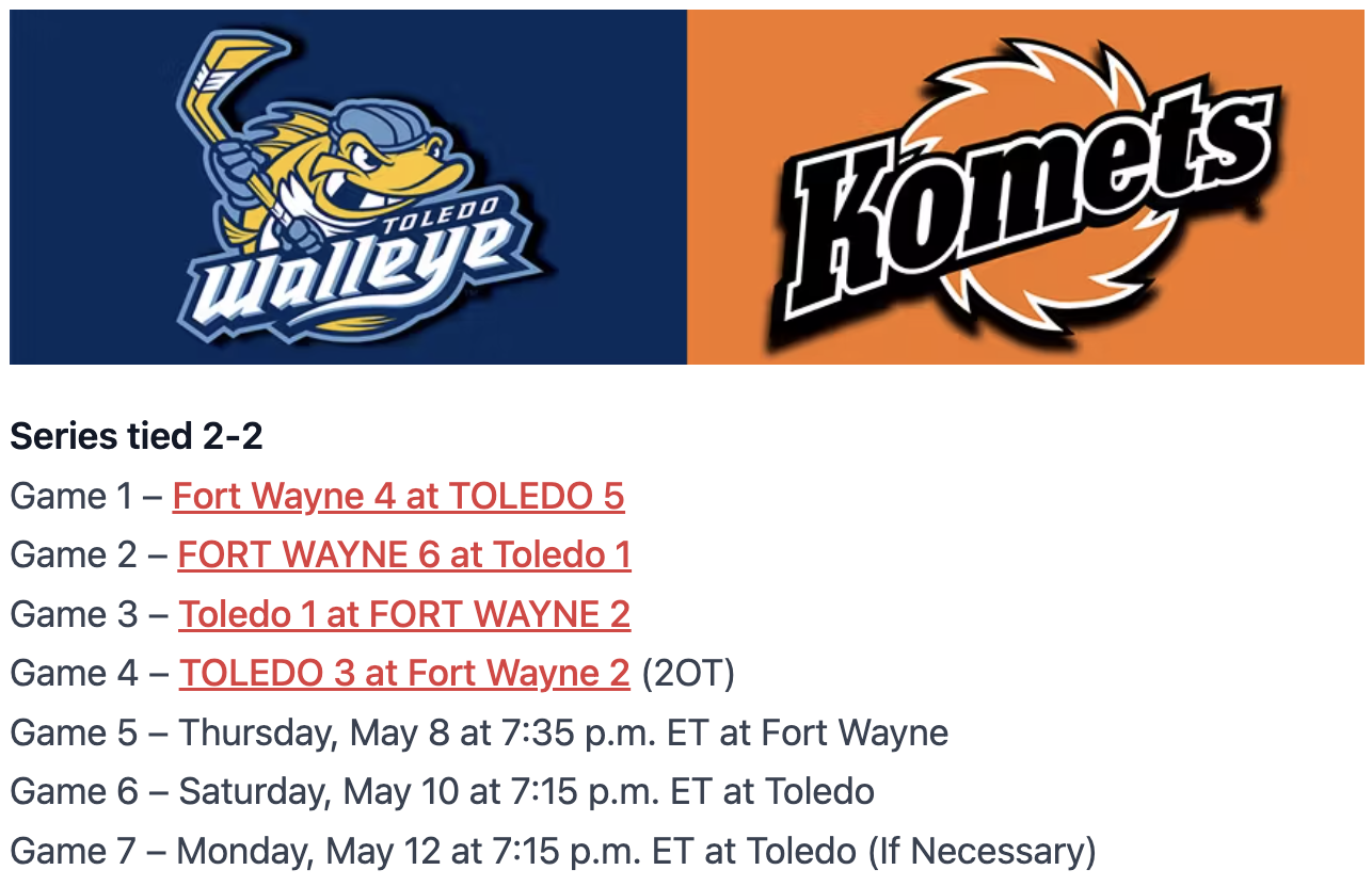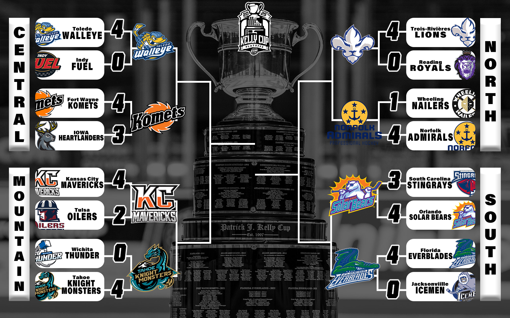 The Tahoe Knight Monsters trail the Kansas City Mavericks 2-0 in the 2025 Kelly Cup Playoffs Mountain Division Finals. Game three is tonight. The Knight Monsters still have to win four of the remaining up to five games to win this series. The 2025 Kelly Cup Playoffs Central Division Finals are tied at 2-2.