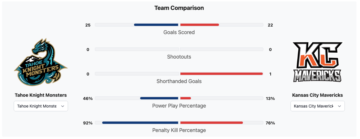 The Kansas City Mavericks had one more 2025 Kelly Cup Playoffs Mountain Division Finals win. The Tahoe Knight Monsters had one more 2025 Kelly Cup Playoffs Mountain Division Finals loss. The Mavericks had scored two more goals in this series. The Knight Monsters had allowed two more goals in this series. The Mavericks had the better goal differential in this series. The Tahoe Knight Monsters had 4 penalty minutes in this series. The Kansas City Mavericks had 8 penalties in this series.