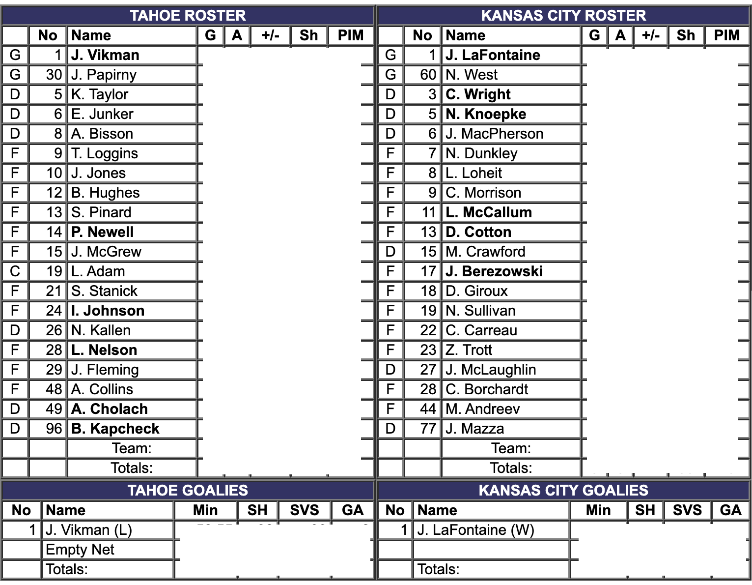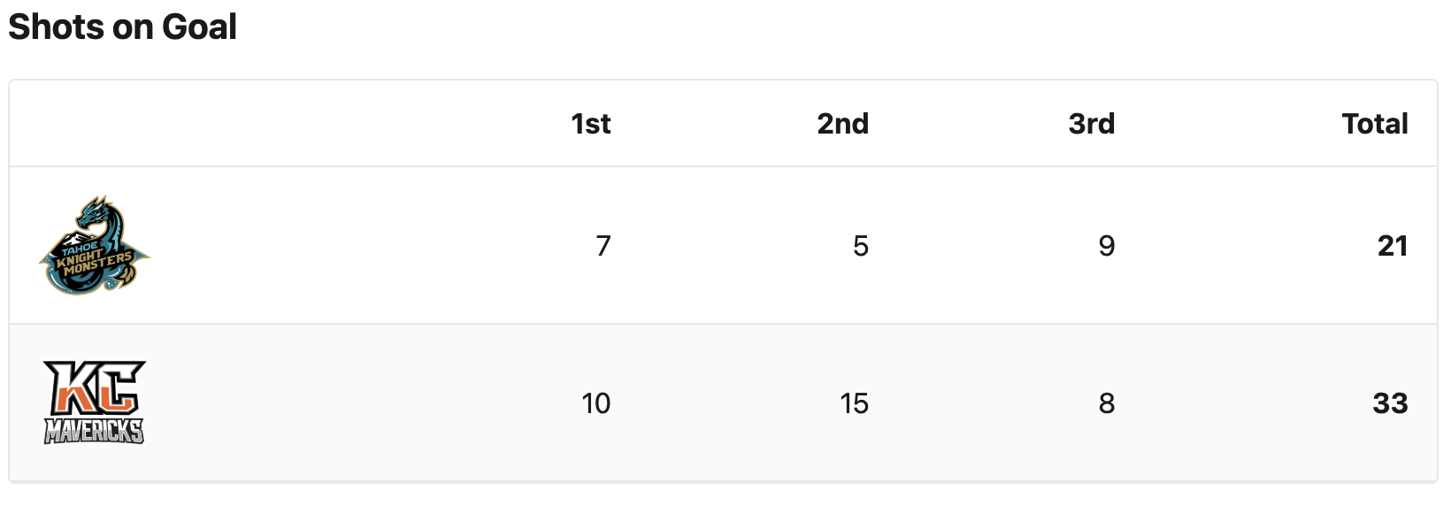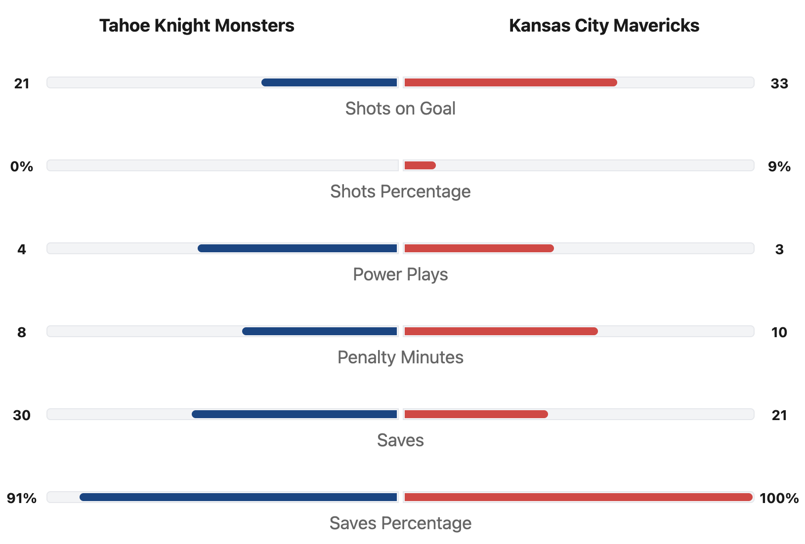 The Kansas City Mavericks had twelve more shots. The Mavericks had the better shot percentage. The Mavericks had two more penalty minutes. #1 Jesper Vikman saved 30 shots for an 91% save percentage for the Tahoe Knight Monsters. #1 Jack LaFontaine saved 21 shots for a 100% save percentage for the Kansas City Mavericks. It was his third shutout of the season.