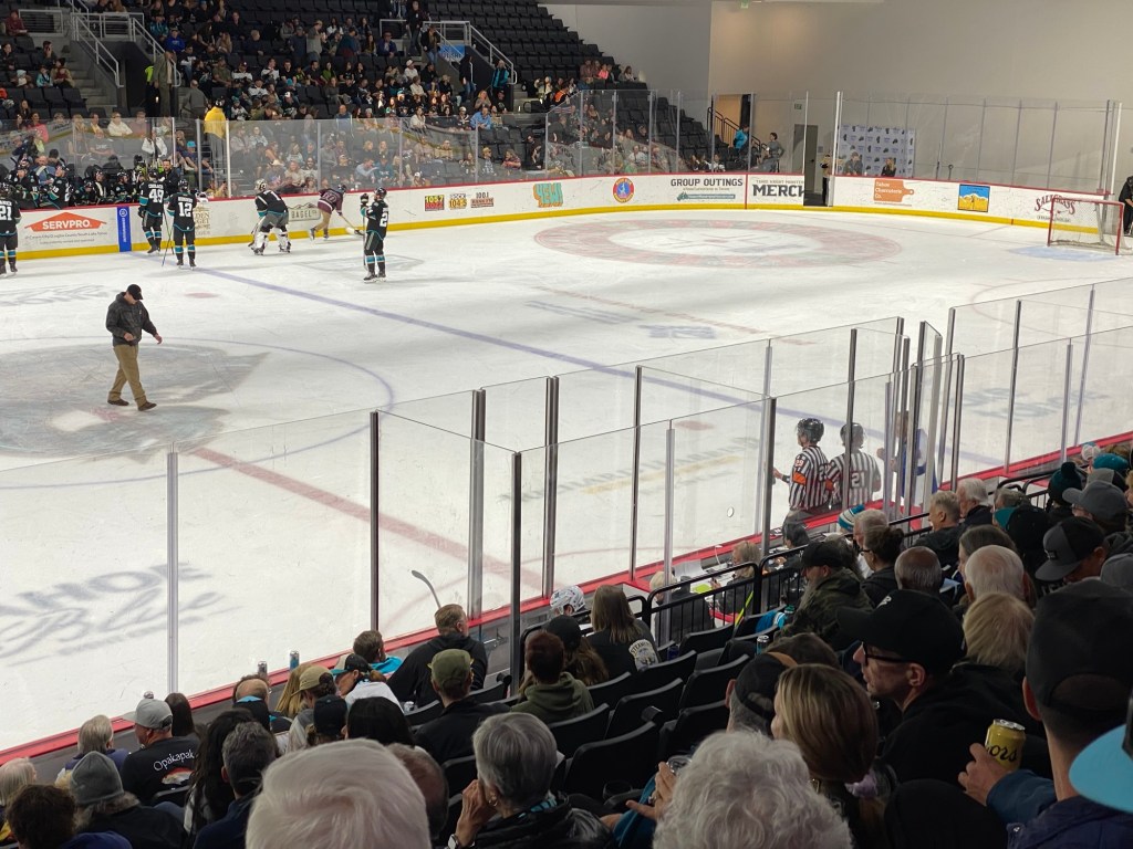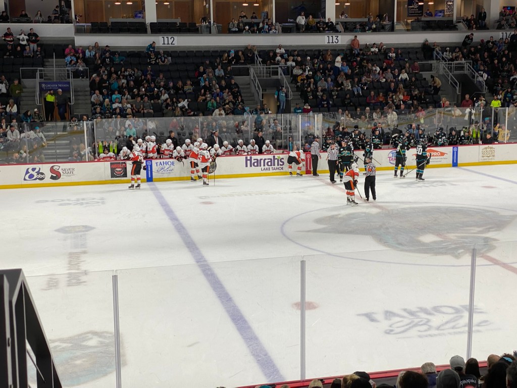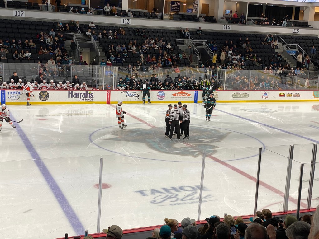 The first period ended in a tie score for the third game in a row. The Tahoe Knight Monsters had an early breakaway in the first period but were unable to capitalize on it. Joe Fleming of the Knight Monsters was looking for a fight right from the start of the game. There were not a lot of stoppages in the first period. The Knight Monsters had a good scoring opportunity on the powerplay in the first period but a stick broke resulting in the opportunity fizzling out. The Kansas City Mavericks penalty by Max Andreev was cause by Andreev hitting a knight monsters player with a stick in the face. The crazy thing about this penalty was that Andreev was on the Mavericks bench. So Andreev stuck his stick over the bench to whack one of the Tahoe Knight Monsters players. It seems like Andreev had intent to injure. Andreev was also lucky he didn’t get tossed from the game. The following boarding penalty by Jett Jones of the Knight Monsters I am pretty sure was a hit to the head on Andreev. There was a lot of extra circular activities after whistles late in the first period. This was also the first game either team scored in the first period of this series. The second period started with the officials talking to the Mavericks coaching staff. There was aggressive playing early into the second period. That would boil over into three penalties early. Jimmy Mazza of the Mavericks should have been ejected as he threw down his gloves and started punching one of the Knight Monsters player catching him by surprise. The Knight Monsters powerplay was weak after that. Late in the second period the Mavericks goalie took his helmet off to get a stoppage in play. That should have been a penalty. It was intentional. There was a lot of back and fourth hockey in the second period with teams trading chances. Midway through the second period, the Mavericks almost scored on a shot that hit the crossbar. Late in the second period one of the Mavericks players hit the Knight Monsters goalie after the whistle. There was no call. Overall in the second period the Knight Monsters had poor passing, poor zone exits, they couldn’t get the puck out of their own zone, they had several minutes without a shot. Two goals lifted the Mavericks to a solid lead after the second period. Midway through the third period, A knight Monsters player tripped the Mavericks goalie behind the play. There was no call. Officials not protecting goals could lead to a massive brawl. The Knight Monsters turned the puck over a lot in the third period. The Mavericks held onto their lead to win.