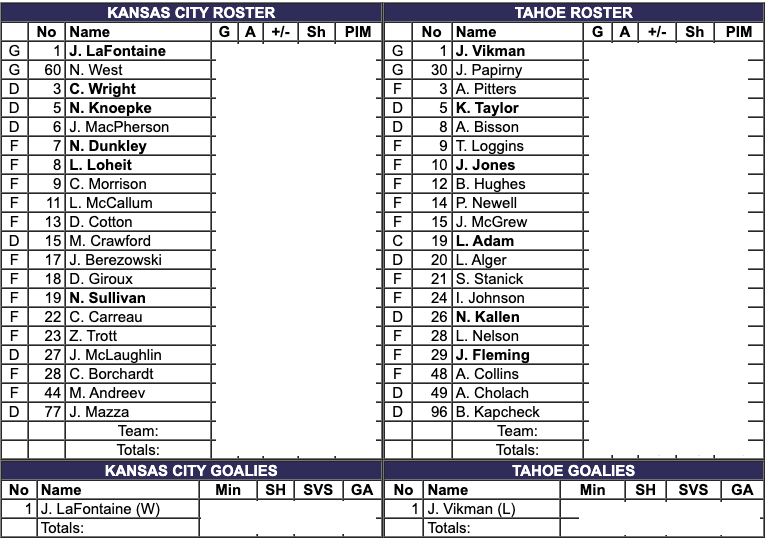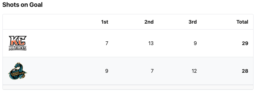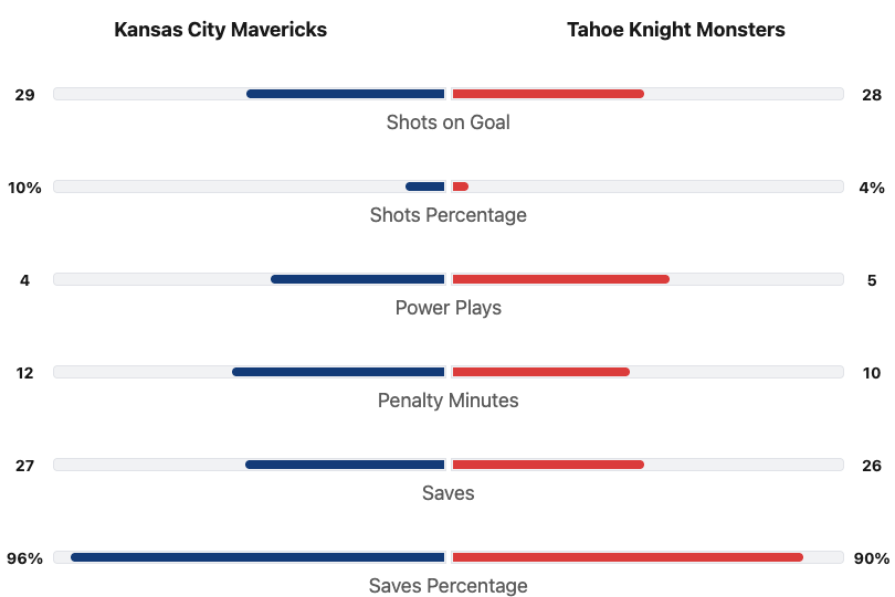 The Kansas City Mavericks had one more shot. The Mavericks had the better shot percentage. The Mavericks had two more penalty minutes. #1 Jesper Vikman saved 26 shots for an 90% save percentage for the Tahoe Knight Monsters. #1 Jack LaFontaine saved 27 shots for a 96% save percentage for the Kansas City Mavericks.