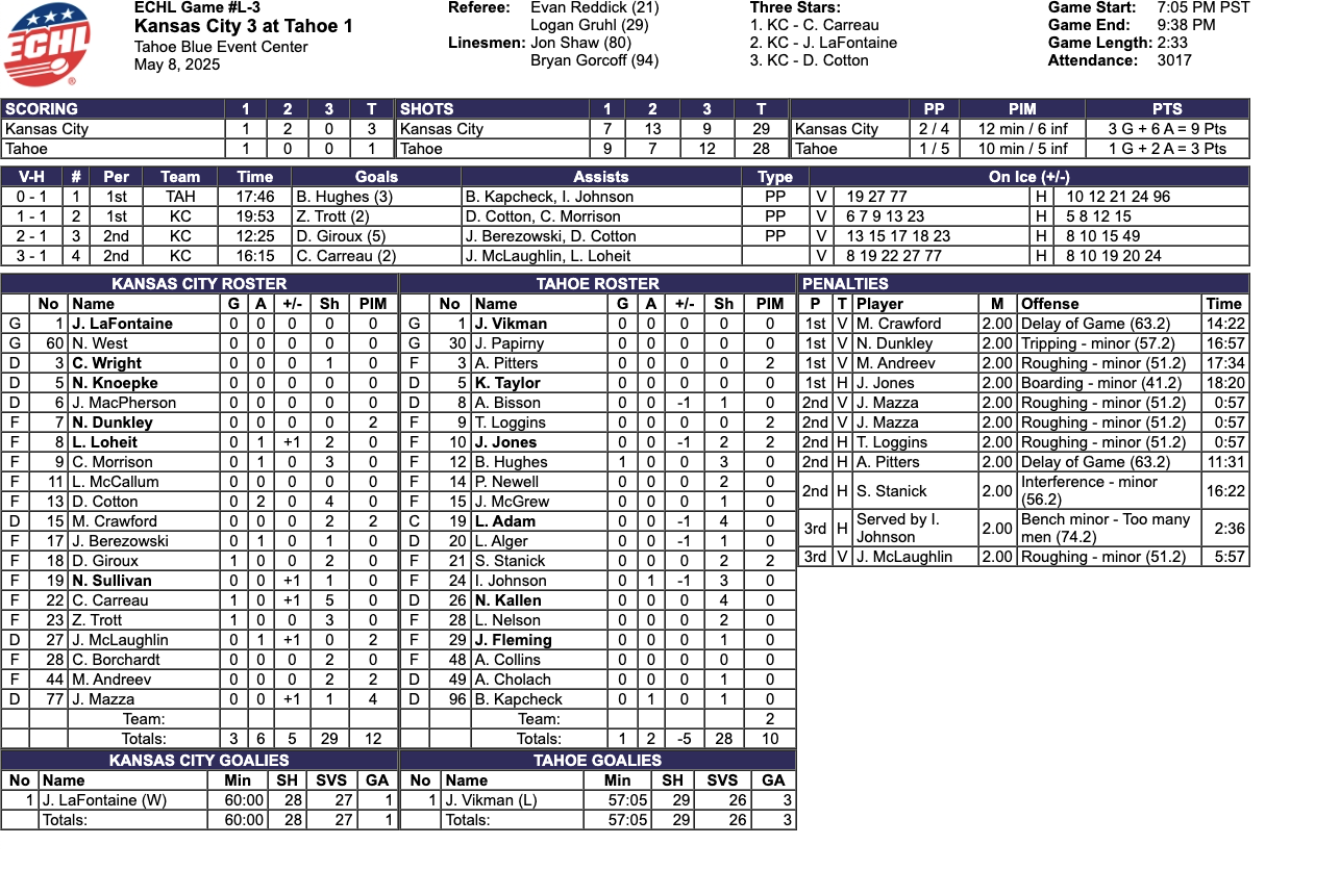 Two minutes into the third period, the Tahoe Knight Monsters received a bench minor penalty for too many men. Five minutes into the third period, Jake McLaughlin of the Kansas City Mavericks received a penalty for roughing. The Knight Monsters would pull their goalie late in the game. Neither team scored in the third period. The final score was 3-1 Kansas City Mavericks.