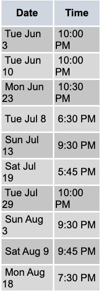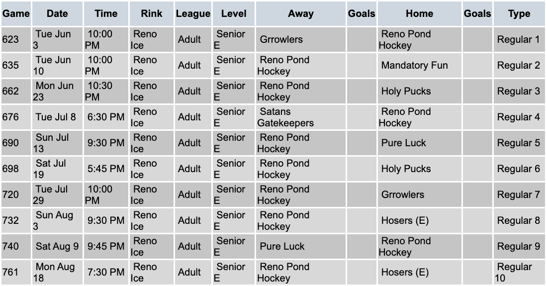 The E-League will have eight teams. Reno Pond Hockey, the Grrrowlers, the Holy Pucks, the Reno Fire Hosers E, Mandatory Fun, Pure Luck, and Satans Gatekeepers are all returning. The Trash Pandas are rejoining the RIAL E-League after being in the RIAL D-League since the RIAL Summer 2023 season. Reno Pond Hockey will the Grrrowlers, the Holy Pucks, Pure Luck, and the Reno Fire Hosers E twice. Reno Pond Hockey will play Mandatory Fun, and Satans Gatekeepers once. The RIAL Summer 2025 season will be from June 2025 to August 2025. Four of the five leagues are participating this season. The RIAL B-League, the RIAL C-League, the RIAL D-League, and the RIAL E-League are participating this season. The RIAL A-League is on hiatus this season. The regular season will have a ten game schedule. Reno Pond Hockey will have three games in June, four games in July, and three games in August. The RIAL Summer 2025 E-League Playoffs start on Wednesday, August 20th, 2025. Reno Pond Hockey has three games this season that start before 9:00 PM. Reno Pond Hockey has seven games this season that start at 9:30 PM or later with four of those games starting after 10:00 PM. The earliest start time is 5:40 PM. The Latest start time is 10:30 PM.