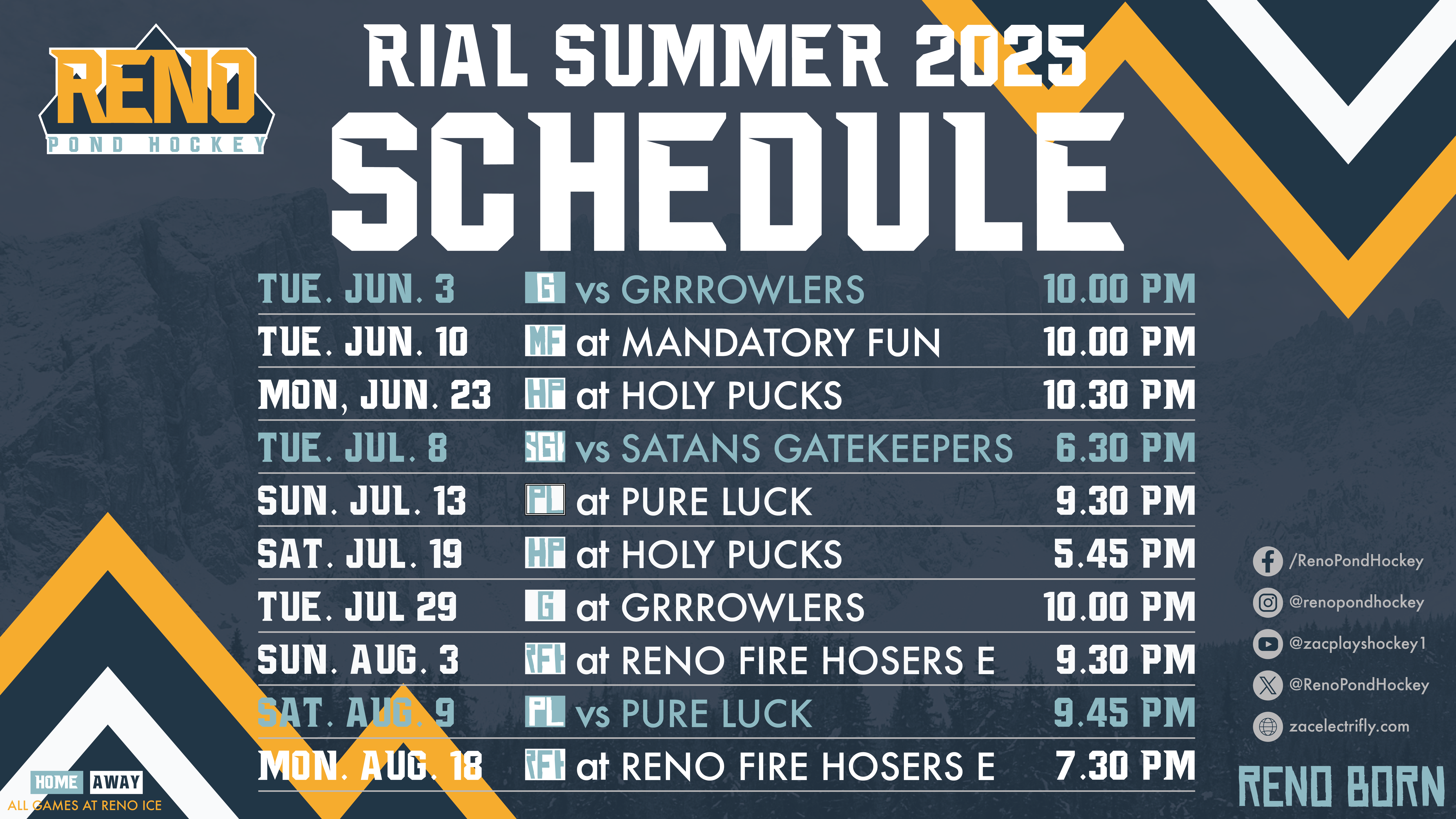 The Reno Pond Hockey schedule for the Reno Ice Adult League Summer 2025 season is out now. You can check out the schedule here. In this post, there is a printable schedule that can be printed or used as a digital wallpaper. There is also a mobile schedule that can be used as a wallpaper for cell phones. There is also a downloadable schedule that can be added to your calendar on your devices.