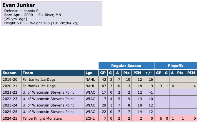 I am really late on these updates but I just wanted to get it out anyway before I got out the season review. On March 9th, 2025, defender Evan Junker was signed by the Tahoe Knight Monsters. Prior to joining the Knight Monsters, Stevens played for the University of Wisconsin Stevens Point. He scored 0 goals with 7 assists for 7 total points in 22 games played for the University of Wisconsin Stevens Point during the 2024-25 season. He also had 14 penalty minutes and a +/- of +7 for the University of Wisconsin Stevens Point during the 2024-25 season. Junker scored 0 goals with 2 assists for 2 points in 7 games with the Knight Monsters during the regular season. He also had 2 penalty minutes and a +/- of 0 during that time. During the playoffs he scored 0 goals with 1 assist for 1 point in 6 games. He also had 0 penalty minutes during the playoffs.