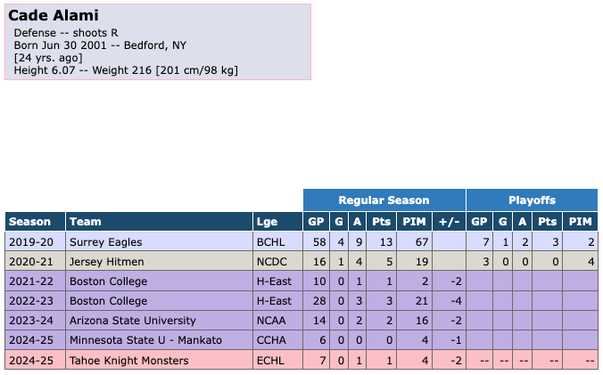 The Tahoe Knight Monsters released defender Cade Alami on March 18th, 2025. Alami signed from college back in February. He scored 0 goals with 1 assist for 1 point in 7 games with the Knight Monsters. He also had 4 penalty minutes and a +/- of -2.