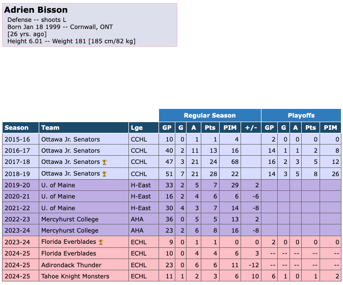 Defender Adrien Bisson was acquired by the Tahoe Knight Monsters from the Adirondack Thunder on March 19th, 2025. The Knight Monsters received Bisson for future considerations. Bisson started off the season on the Florida Everblades. He scored 0 goals with 4 assists for 4 points in 10 games for the Everblades. He had 6 penalty minutes and a +/- of +3 during that time. He scored 0 goals with 6 assists for 6 points in 23 games for the Adirondack Thunder. He had 11 penalty minutes and a +/- of -12 during that time. He scored 1 goal with 2 assists for 3 points in 11 games during the regular season with the Knight Monsters. He had 6 penalty minutes with a +/- of +10 during that time. He scored 1 goal with 0 assists for 1 point in 6 games during the playoffs. He had 2 penalty minutes during the playoffs.
