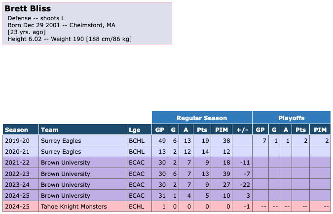The Tahoe Knight Monsters signed defender Brett Bliss on March 21st, 2025. Bliss scored 1 goal with 4 assists for 5 points in 31 games for Brown University during the 2024-25 season. During that time he had 10 penalty minutes and a +/- of +3. Bliss scored 0 goals with 0 assists for 0 points in 1 game with the Knight Monsters. He had 0 penalty minutes and a +/- of -1 during that game. Bliss was released by the Knight Monsters on March 29th, 2025.
