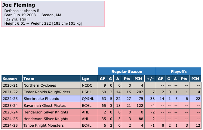 On March 31st, 2025, defender Joe Fleming was assigned to the Tahoe Knight Monsters by the Henderson Silver Knights. Fleming added some extra toughness to the Knight Monsters prior to the playoffs. He scored 0 goals with 3 assists for 3 points in 35 games for the Silver Knights. He had 88 penalty minutes and a +/- of +2 during that time. He scored 2 goals with 0 assists for 2 points in 6 games with the Knight Monsters during the regular season. He had 4 penalty minutes and a +/- of -1 during that time. He scored 2 goals with 1 assist for 3 points in 8 games during the playoffs for the Knight Monsters. He had 12 penalty minutes during the playoffs.