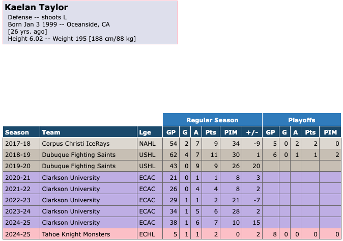 The Tahoe Knight Monsters signed defender Kaelan Taylor on April 2nd, 2025. Taylor played most of the 2024-25 season with Clarkson University in the NCAA. He scored 1 goal with 6 assists for 7 points in 38 games for Clarkson University. He had 10 penalty minutes and a +/- of +15 during that time. He scored 1 goal with 1 assist for 2 points in 5 games during the regular season fir the Knight Monsters. He had 0 penalty minutes and a +/- of +2 during that time. He scored 0 goals with 0 assists for 0 points in 8 games for the Knight Monsters during the playoffs. He had 0 penalty minutes during the playoffs.