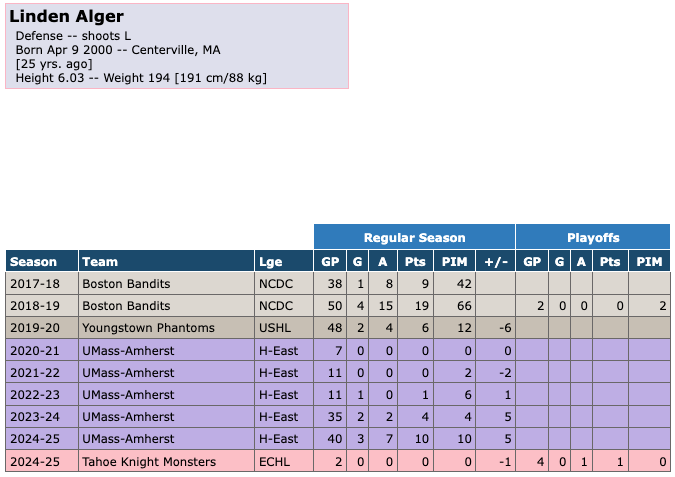 The Tahoe Knight Monsters signed defender Linden Alger on April 12th, 2024. He had played all of the 2024-25 season with UMass-Amherst in the NCAA until signing with the Knight Monsters. He scored 3 goals with 7 assists for 10 points in 40 games with UMass-Amherst. During that time he had 10 penalty minutes with a +/- of +5. He scored 0 goals with 0 assists for 0 points in 2 games with the Knight Monsters during the regular season. He had 0 penalty minutes durning that time and a +/- of -1. He scored 0 goals with 1 assist for 1 point in 4 games with the Knight Monsters during the playoffs. He had 0 penalty minutes during the playoffs.