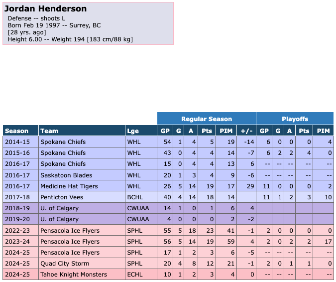 The Tahoe Knight Monsters released defender Jordan Henderson on March 31st, 2025. Henderson was signed back in February after playing in the SPHL. He scored one goal with 2 assists for three points in 10 games for the Knight Monsters. He had 4 penalty minutes with a +/- of 0 during that time.