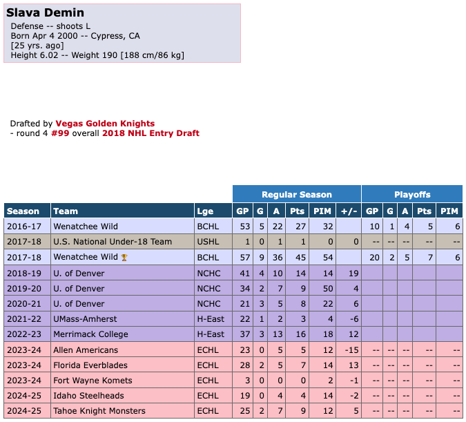 On March 31st, 2025, the Tahoe Knight Monsters released defender Slava Demin. He was traded to the Knight Monsters by the Idaho Steelheads in January. He scored 2 goals with 7 assists in for 9 points in 25 games with the Knight Monsters. He had 12 penalty minutes and a +/- of +5 during that time.