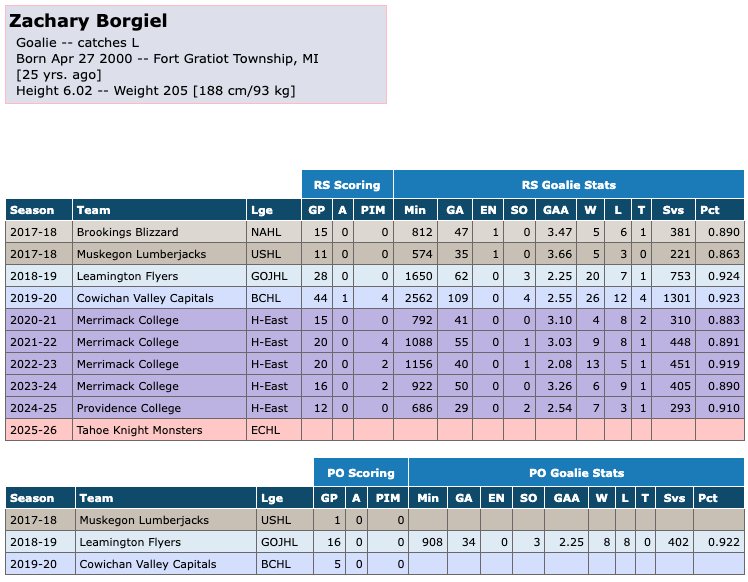 Zachary Borgiel arrived with a solid amateur résumé. He played junior hockey in the NAHL, USHL, GOJHL, and BCHL, and competed in the NCAA with Merrimack College and Providence College. Last season with Providence, he suited up for 12 games, logging 686 minutes with a 2.54 goals-against average and a .910 save percentage. His time with the Knight Monsters was brief, he didn’t appear in a single game before being released. He had no prior professional experience.