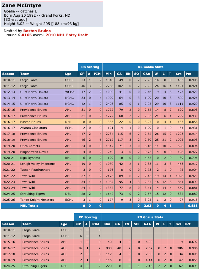 In this post, I want to take a closer look at the Tahoe Knight Monsters transactions so far this season. It’s been an especially busy stretch for the organization, starting early on when Vegas Golden Knights goaltender Adin Hill went down with an injury. That led to Carl Lindbom being called up from the Henderson Silver Knights, which in turn prompted Henderson to call up Cameron Whitehead from the Knight Monsters. To fill the gap, Tahoe signed goaltender Zachary Borgiel to a standard player contract (SPC), which is the league’s minimum contract. Not long after, Tahoe’s other goalie, Jordan Papirny, was also called up to Henderson. Suddenly, both of the Knight Monsters opening-night goaltenders were in the AHL, leaving Tahoe with only one netminder available. In response, the team signed Zane McIntyre to another SPC. Henderson would send Papirny back down to Tahoe, and the Knight Monsters released Borgiel.