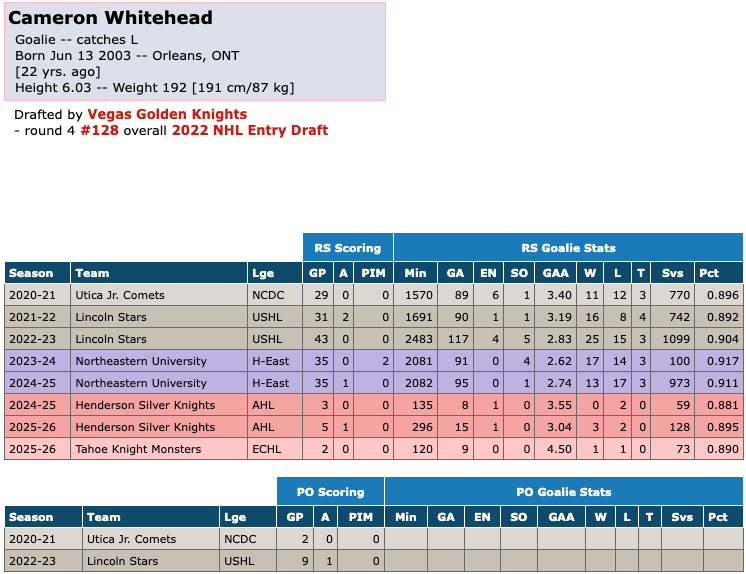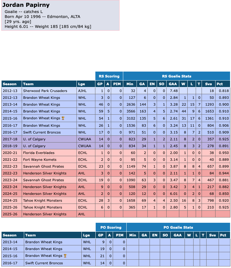 On November 10th, 2025, the goalie carousel continued. Jordan Papirny was called up again to the Henderson Silver Knights, while Cameron Whitehead was reassigned back to Tahoe as part of the transaction. Papirny, now in his second year with the Knight Monsters, has been strong this season, appearing in six games and logging 365 minutes with a 2.80 goals-against average and a .925 save percentage. He has yet to play for Henderson this year. Whitehead, meanwhile, has played only two games for Tahoe so far, recording a 4.50 goals-against average and a .890 save percentage in 120 minutes. With Henderson, he has appeared in five games, playing 296 minutes with a 3.04 goals-against average and a .895 save percentage.