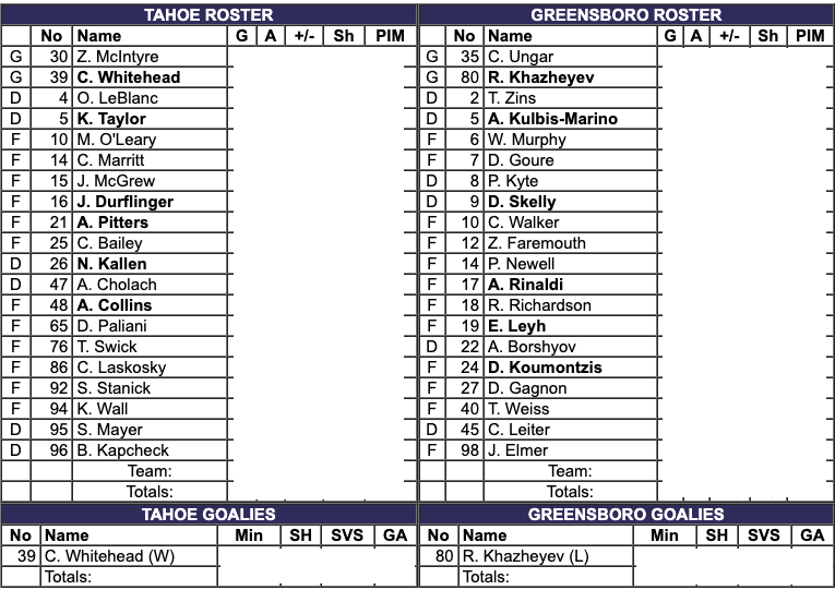 Tahoe took the lead early in the game. They actually built on their lead early in the second period. Then Greensboro kept the game close with a late second period goal. Then Tahoe dominated the third period to win. Tahoe snapped the three game skid. They finally found themselves a win in Greensboro. They almost left Greensboro empty handed. Tahoe got back to winning. It was good to see. Now their long road trip comes to an end as they return home.