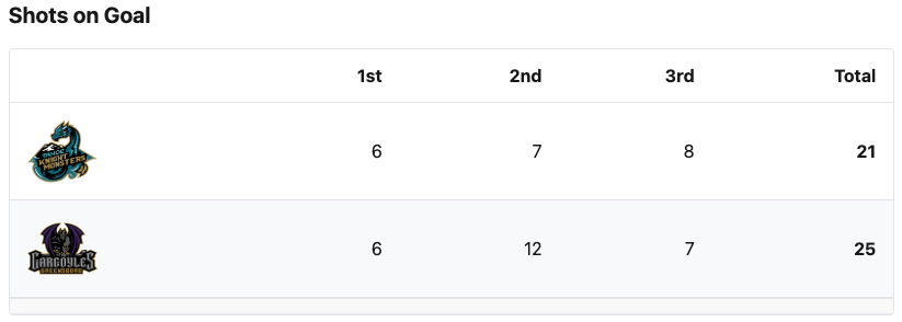 With under a minute remaining in the second period, the Gargoyles scored. The goal was scored by #19 Ethan Leyh. The goal was assisted by #17 Anthony Rinaldi and #5 Andrius Kulbis-Marino.