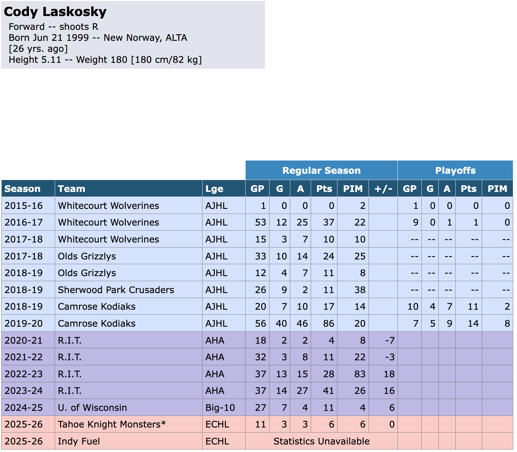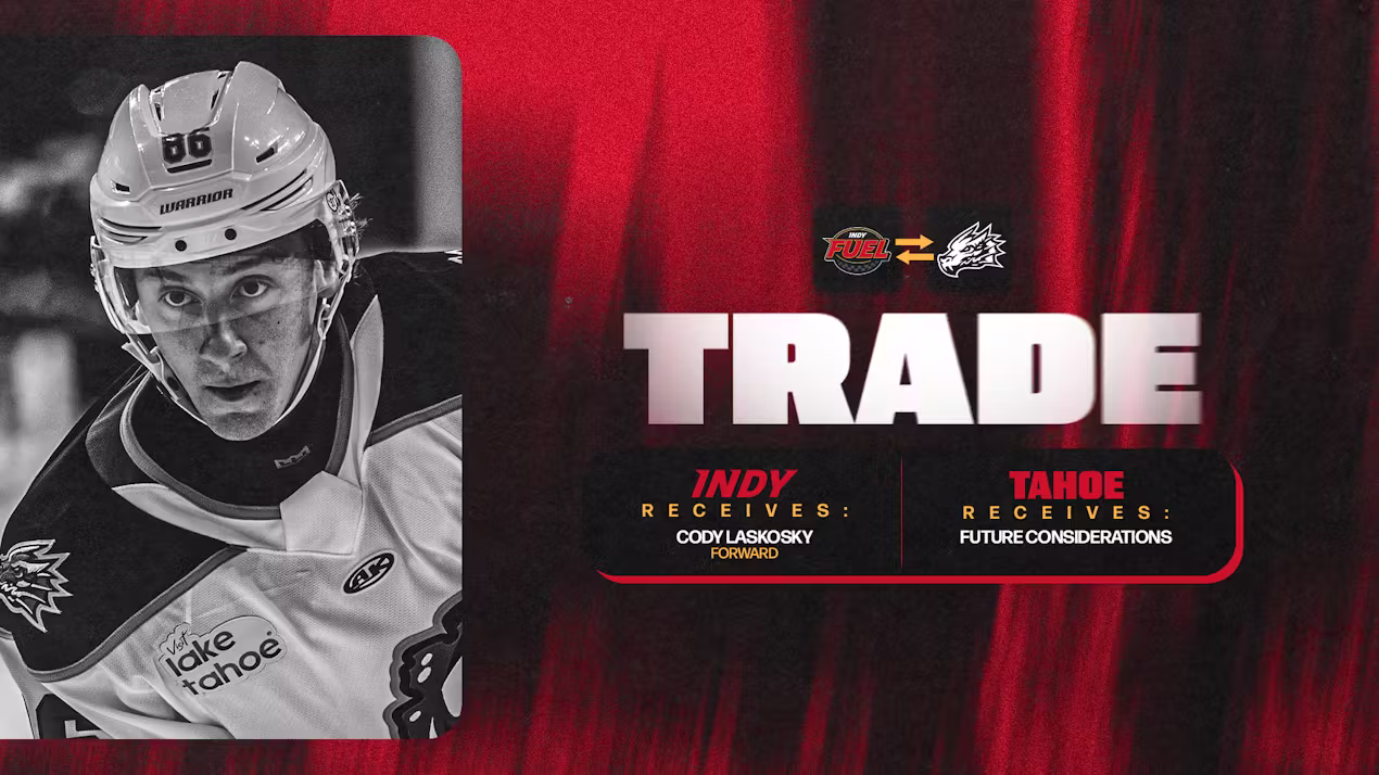 On Friday, November 21st, forward Cody Laskosky was traded from the Tahoe Knight Monsters to the Indy Fuel in exchange for future considerations. Laskosky, who is in his rookie season, appeared in eleven games for Tahoe, recording 3 goals and 3 assists for a total of 6 points. He also accumulated 6 penalty minutes and finished with an even plus-minus rating of 0 during his time with the Knight Monsters. While his stay in Tahoe was brief, Laskosky showed promise as a young player, and fans will be watching to see how he develops with the Indy Fuel.