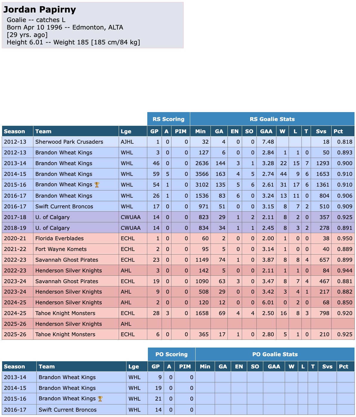 On Tuesday, November 18th, goaltender Jordan Papirny was reassigned from the Henderson Silver Knights to the Tahoe Knight Monsters. Papirny did not see any game action in the AHL this season, but he has appeared in six ECHL games for the Knight Monsters, logging 365 minutes in net. Over that span, he has allowed 17 goals while making 210 saves, posting a strong 2.80 goals-against average and an impressive .925 save percentage. Papirny’s return to Tahoe comes as Carter Hart was loaned from the Vegas Golden Knights to Henderson to gain some playing time before joining the NHL squad, giving Papirny the opportunity to step back into the ECHL crease and provide stability for the team.