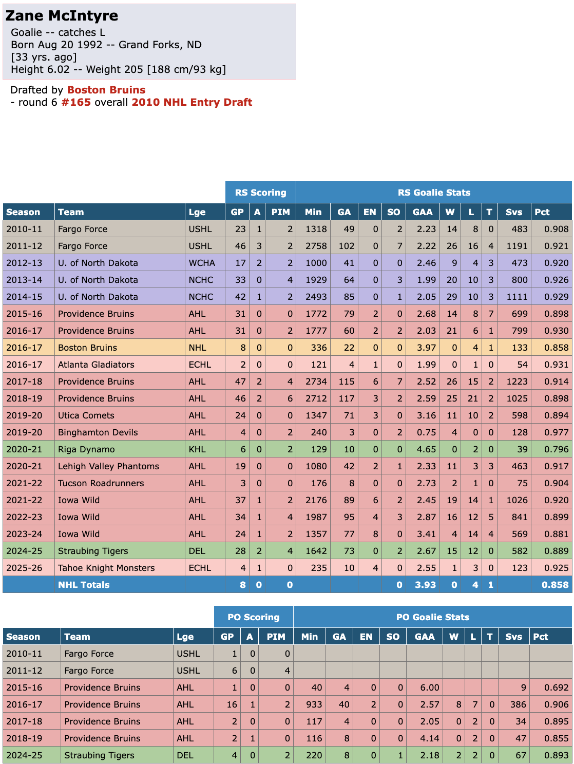 On Tuesday, November 18th, the Tahoe Knight Monsters announced the release of goaltender Zane McIntyre, who had been with the team on a standard player contract. McIntyre was originally signed after both Jordan Papirny and Cameron Whitehead were called up by the Henderson Silver Knights, providing depth in net for Tahoe. During his time with the Knight Monsters, McIntyre appeared in four games, logging 235 minutes in goal. In that span, he recorded one assist, made 123 saves, and allowed 10 goals, finishing with a solid 2.55 goals-against average and a .925 save percentage. While his stay in Tahoe was brief, McIntyre’s performance reflected his reliability and professionalism between the pipes.