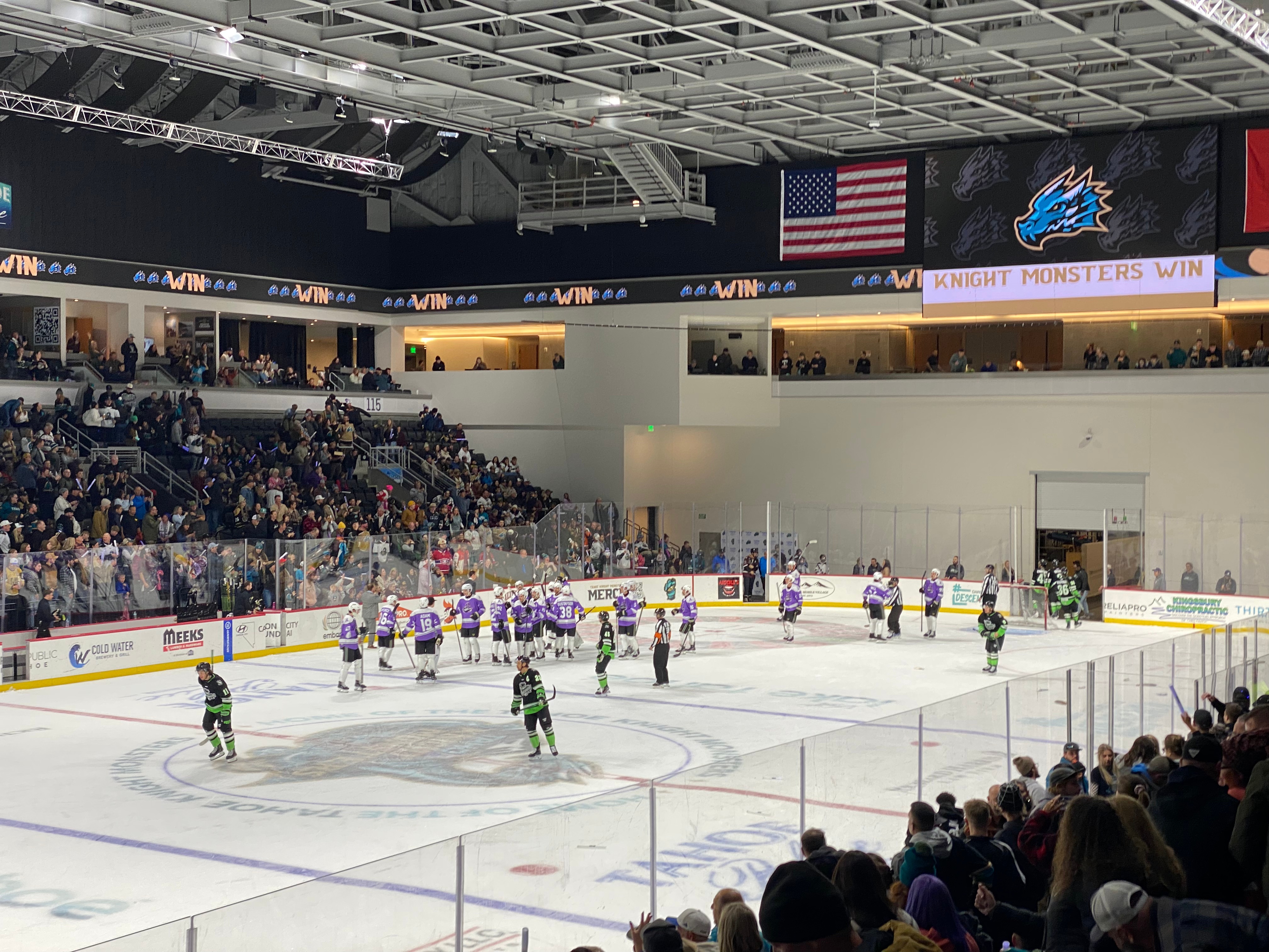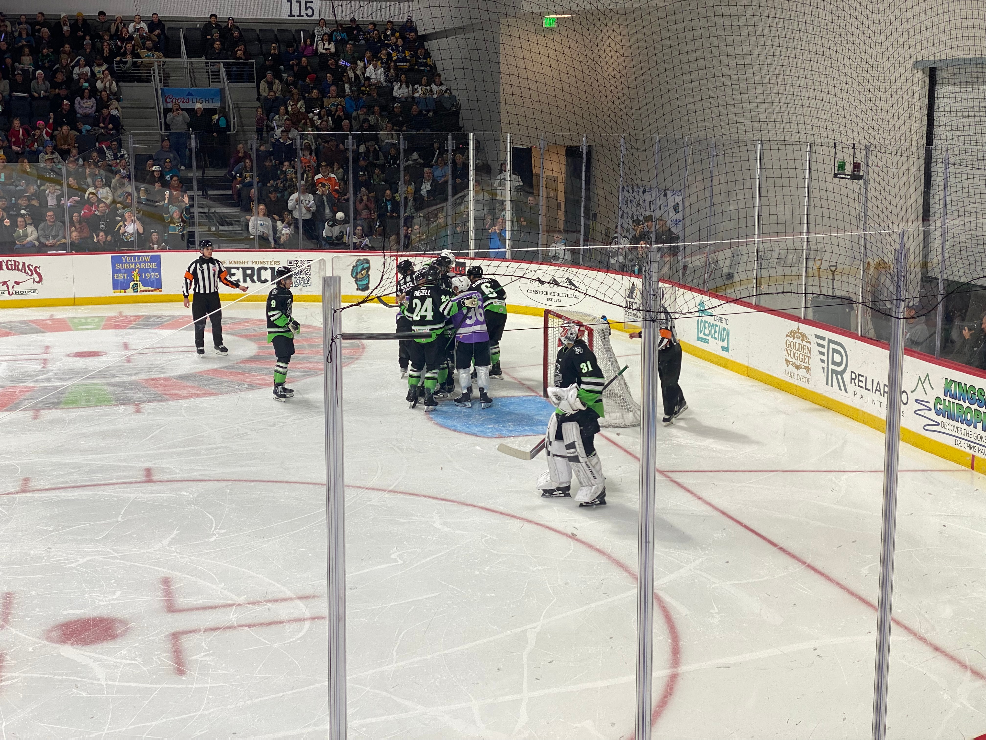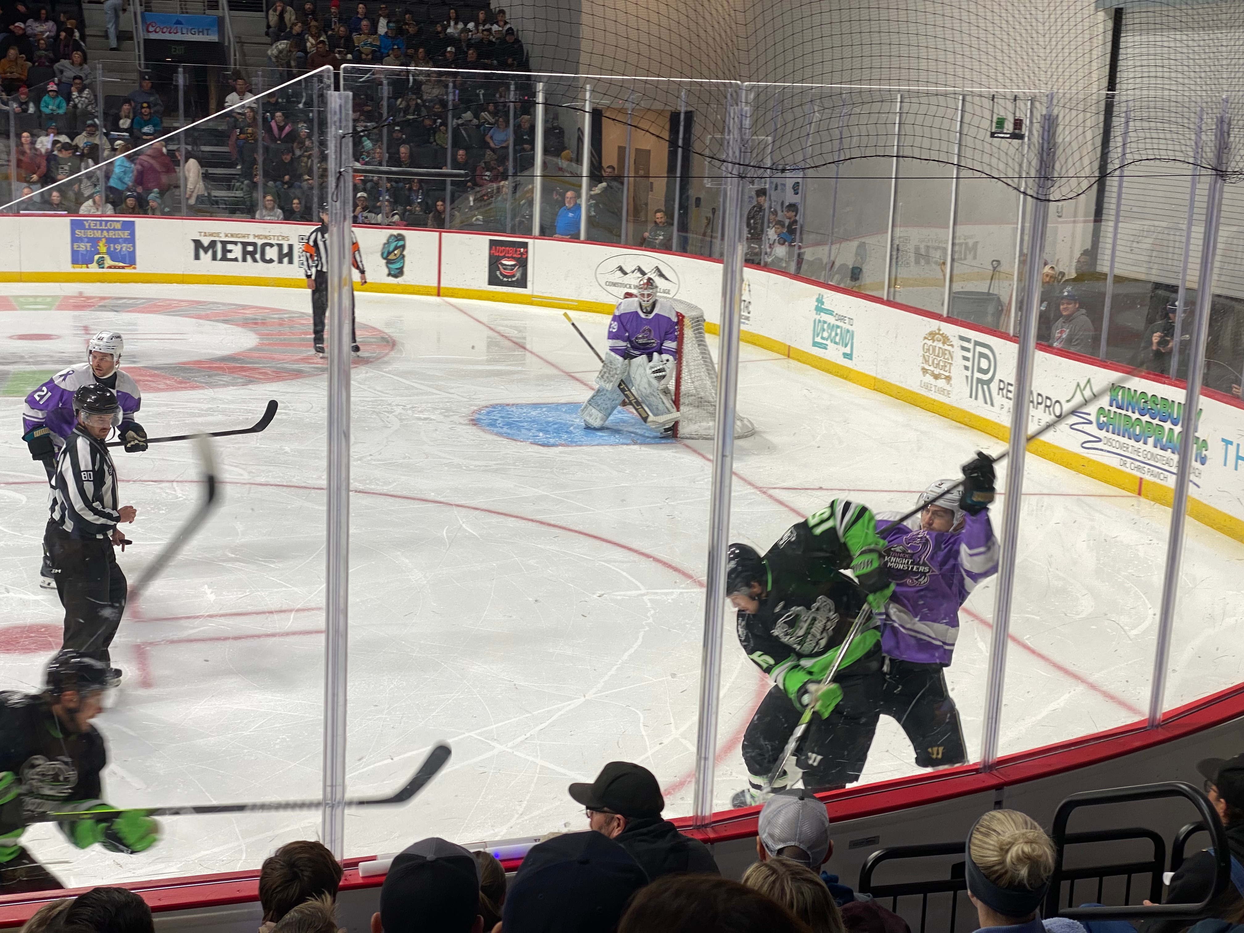 The Ghost Pirates did pull their goalie. The Knight Monsters didn’t score on the empty net. The Ghost Pirates could tie the game with the extra man. The final score was 4-3 Tahoe Knight Monsters.