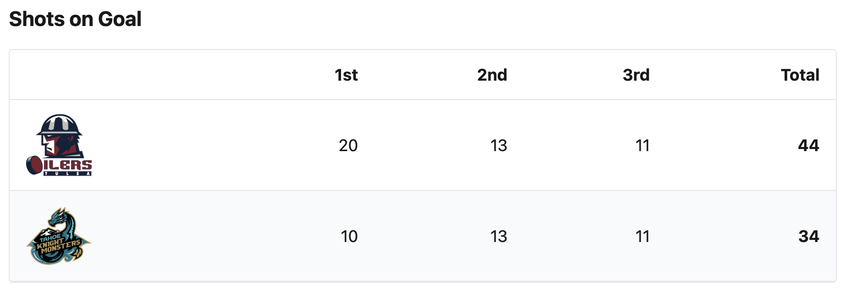 The final score was 5-2 Tahoe Knight Monsters. The Tahoe Knight Monsters finished this series 3-0-0 against the Tulsa Oilers. The Tahoe Knight Monsters have won their last four games.