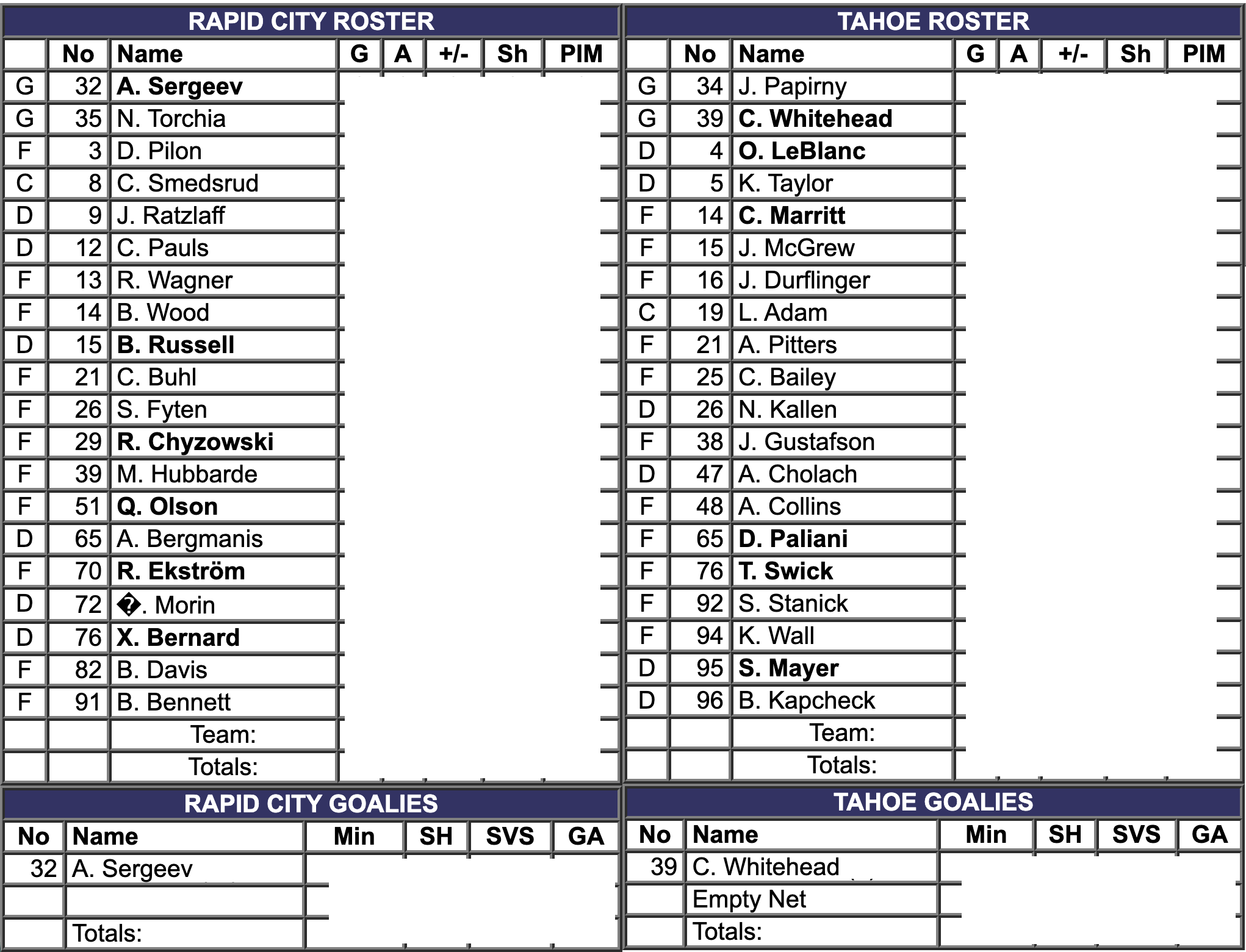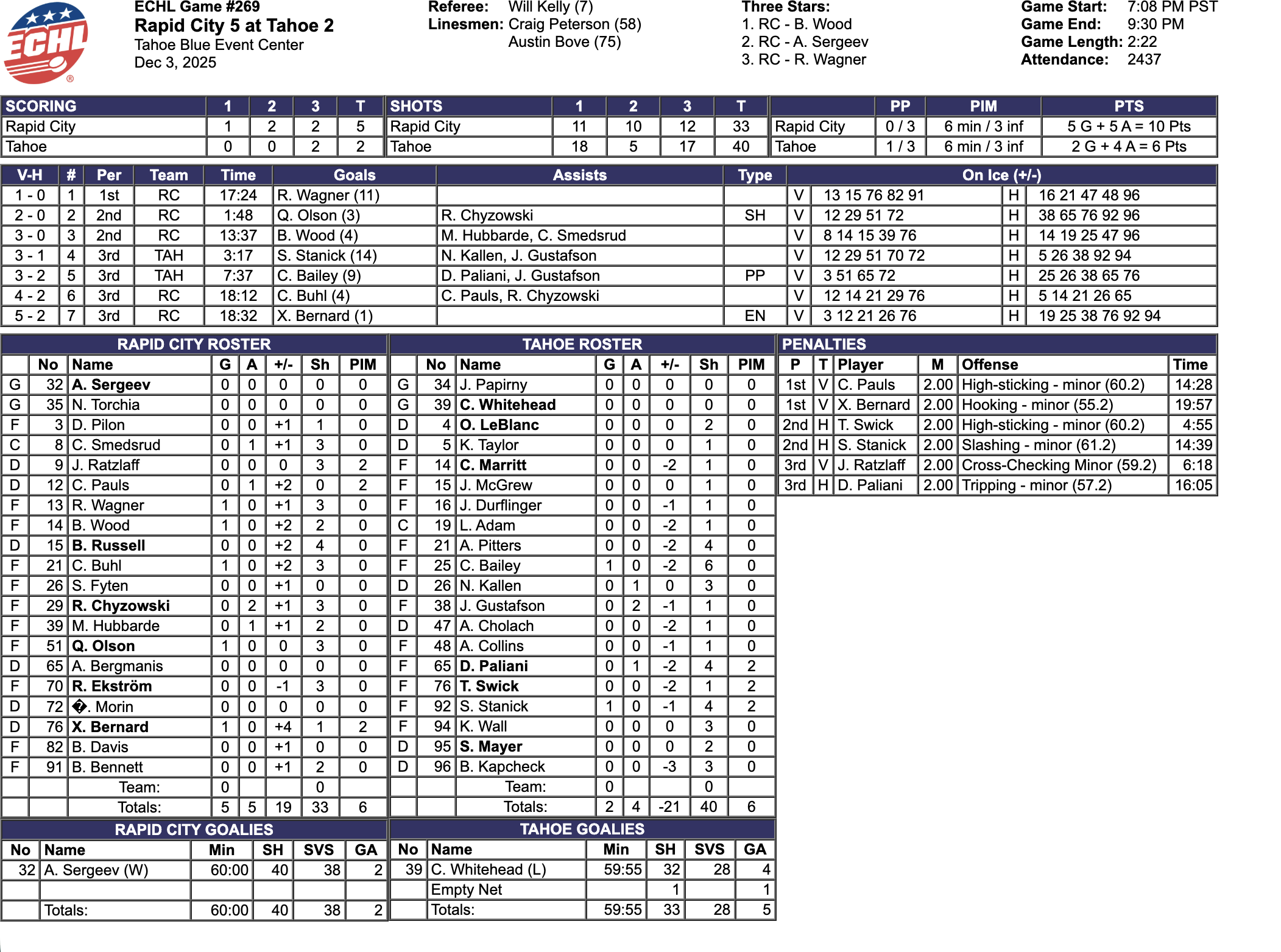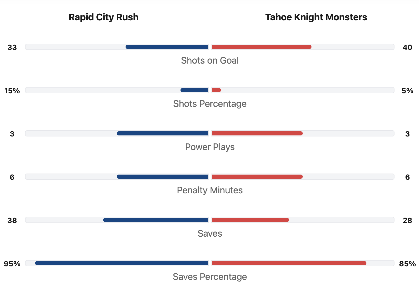 Statistically, the Knight Monsters controlled much of the shot volume, firing 40 shots compared to Rapid City’s 33, but the Rush made their chances count with a stronger shooting percentage. Both teams had an identical three power play opportunities and six penalty minutes. Tahoe managed to convert just one of their power play chances while surrendering a costly shorthanded goal. Rapid City, meanwhile, went 0 for 3 with the man advantage. In net, Cameron Whitehead stopped 28 of 33 shots for an .85 save percentage for Tahoe. While Arsenii Sergeev delivered an impressive performance for the Rush, turning aside 38 of 40 shots for a .95 save percentage. Despite generating more offense, Tahoe couldn’t solve Sergeev often enough to change the outcome.