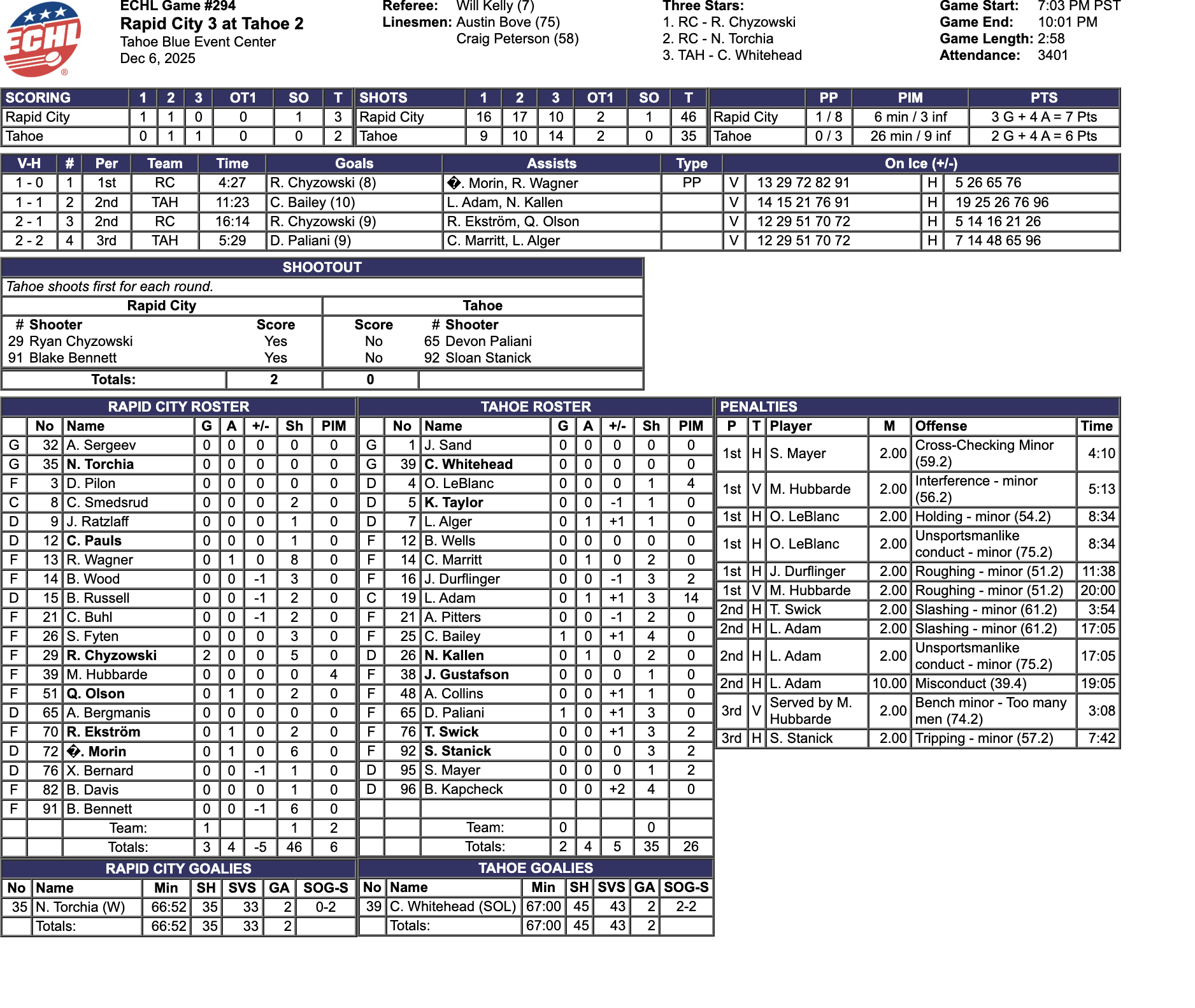 Seven minutes into the third period, Sloan Stanick of Tahoe was called for tripping. Regulation would end in a 2-2 tie. The game would go into overtime.