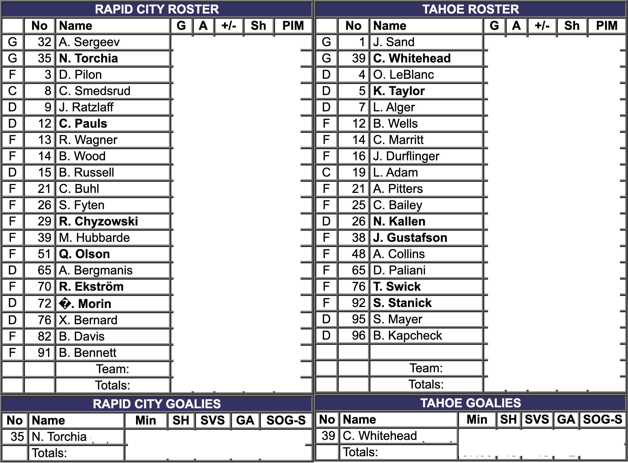 Five minutes into the game, Matt Hubbarde of the Rush was called for interference. Eight minutes into the game, Olivier LeBlanc of Tahoe was called for unsportsmanlike conduct and holding. With under nine minutes remaining in the first period, Jake Durflinger of Tahoe was called for roughing. At the end of the period, Matt Hubbarde of the Rush was called for roughing. The Rapid City Rush had a 1-0 lead after the first period.