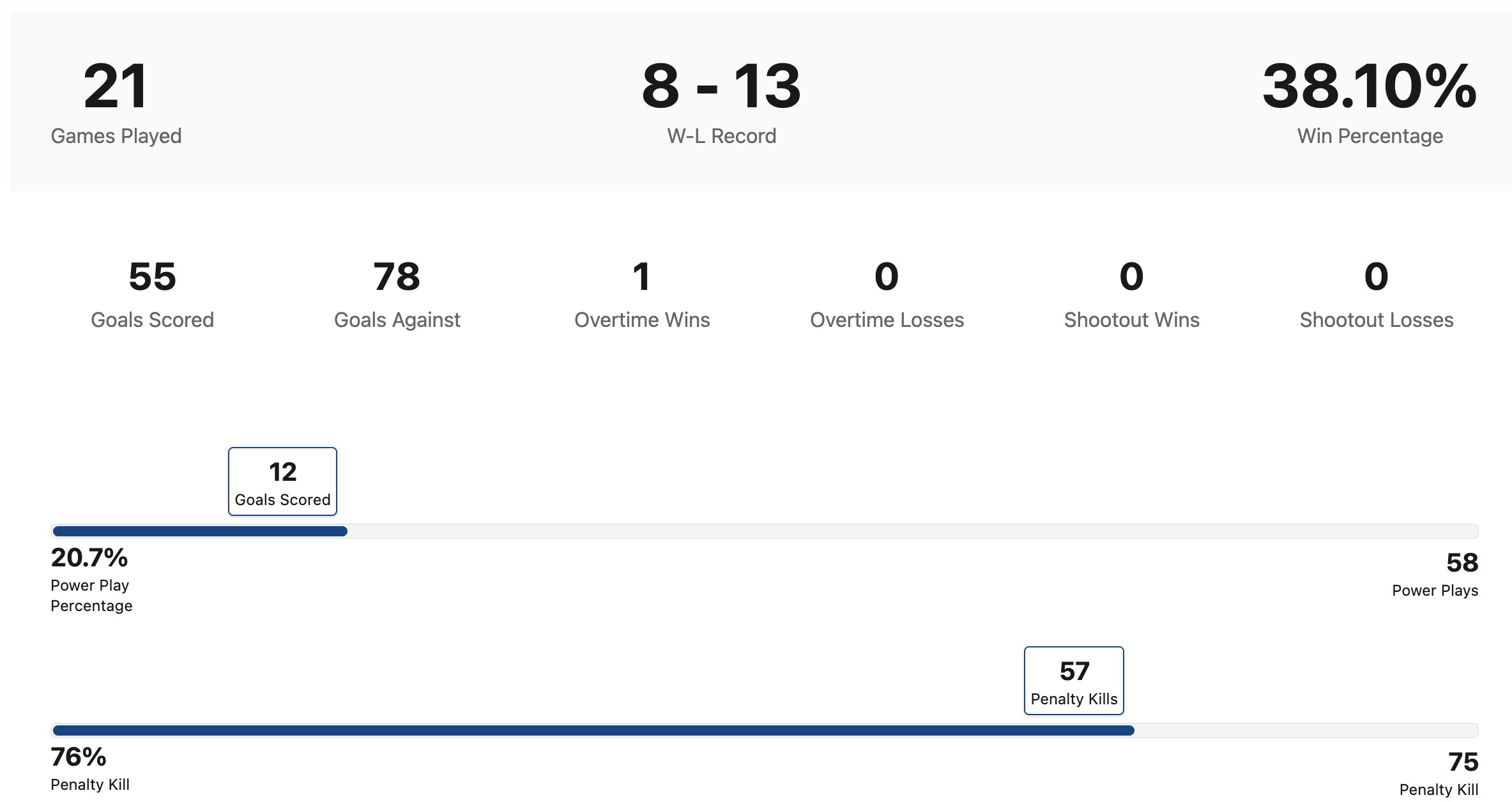 The Tahoe Knight Monsters enter this matchup searching for their fifteenth win of the season and, just as importantly, a bounce-back performance. Offense has been hard to come by lately, as Tahoe has struggled to generate consistent scoring and has been unable to build or protect leads. Defensive lapses have also been costly, with the Knight Monsters allowing 40-plus shots per game and putting added pressure on their goaltenders. Those issues have contributed to Tahoe sliding from first to third in the division, making a complete, disciplined effort essential as they look to get back on track with a solid win.