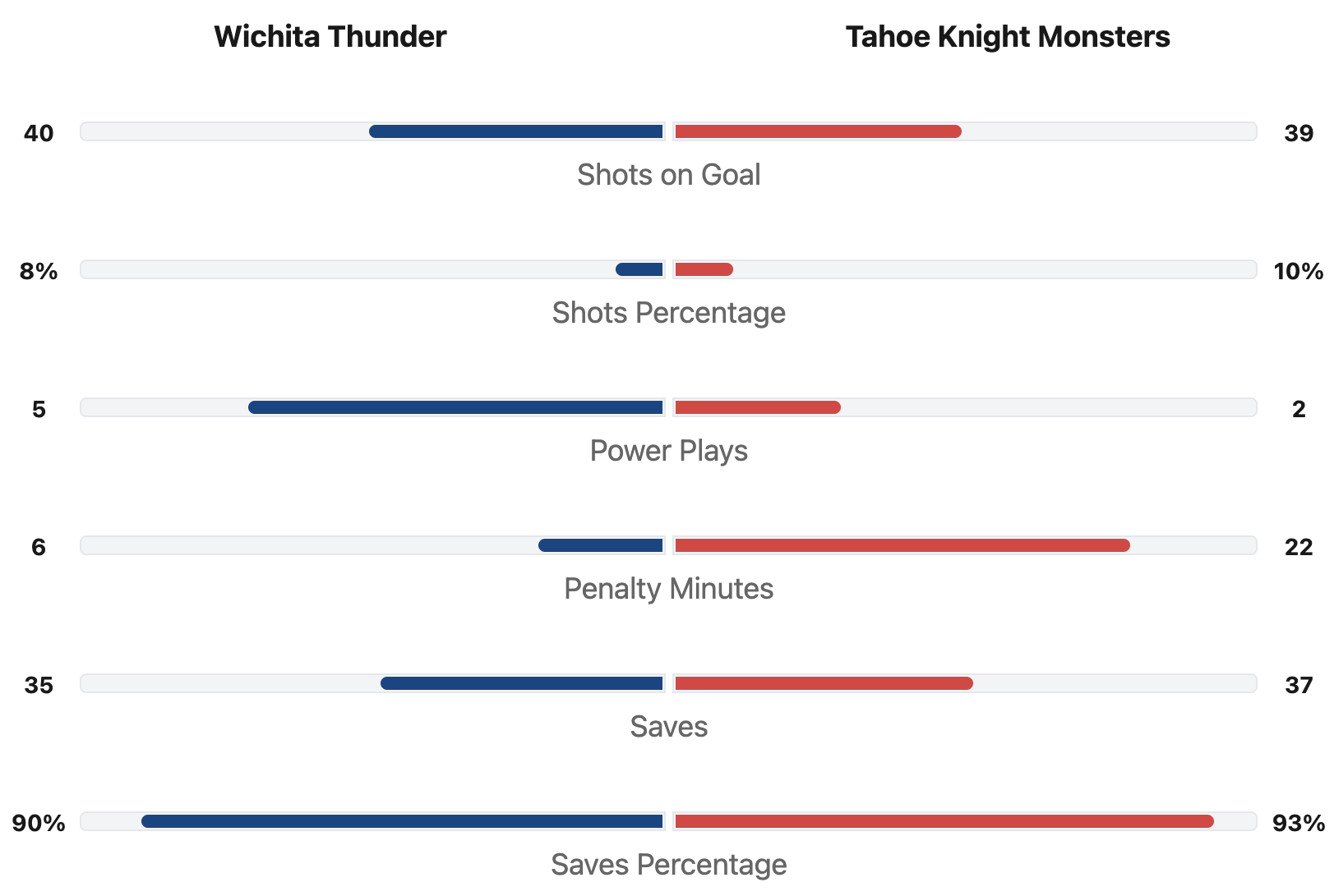 Statistically, the game was as tight as the scoreboard suggested. Wichita finished with a slight edge in shots on goal, recording 40 compared to Tahoe’s 39, though the Knight Monsters were more efficient with their chances and posted the better shooting percentage. Special teams tilted in Wichita’s favor in terms of opportunities, as the Thunder earned 5 power plays to Tahoe’s 2 and finished the night with more chances overall. Discipline was a challenge for the Knight Monsters, who racked up 22 penalty minutes, 16 more than Wichita’s 6. The Thunder capitalized on the advantage by scoring the game’s lone power-play goal, while Tahoe answered in dramatic fashion by recording the only shorthanded goal of the night. In net, Jordan Papirny was excellent for the Knight Monsters, stopping 37 of 40 shots for a .930 save percentage. On the other end, Roddy Ross turned aside 35 of 39 shots for Wichita, finishing with a .900 save percentage.