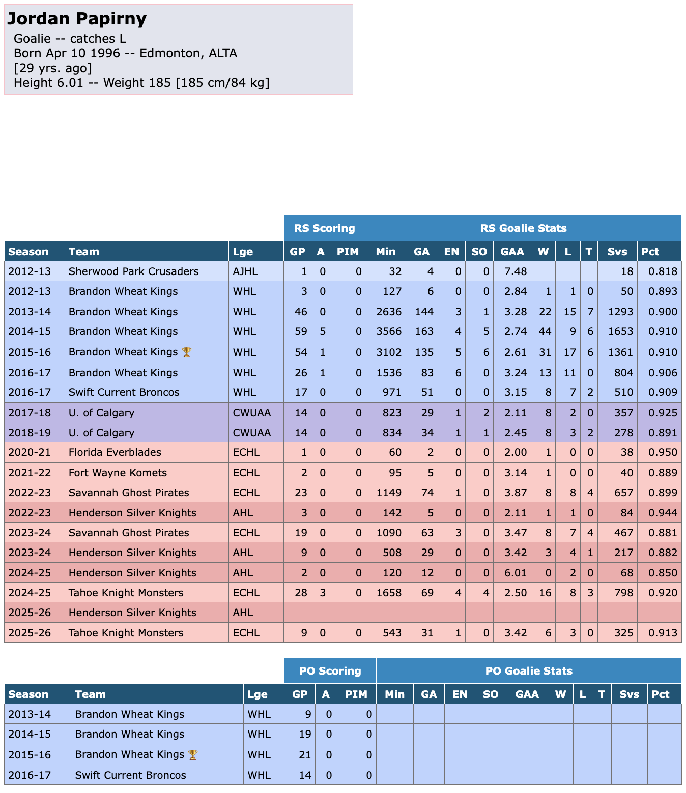 On Friday, December 5th, goaltender Jordan Papirny was recalled by the Henderson Silver Knights before being reassigned to the Tahoe Knight Monsters on Sunday, December 7th. Despite the brief call-up, Papirny has yet to see any AHL ice time this season. At the ECHL level, he has appeared in nine games for the Knight Monsters, logging 543 minutes in goal. During that stretch, Papirny has allowed 31 goals while making 325 saves, posting a 3.42 goals-against average and a .913 save percentage.