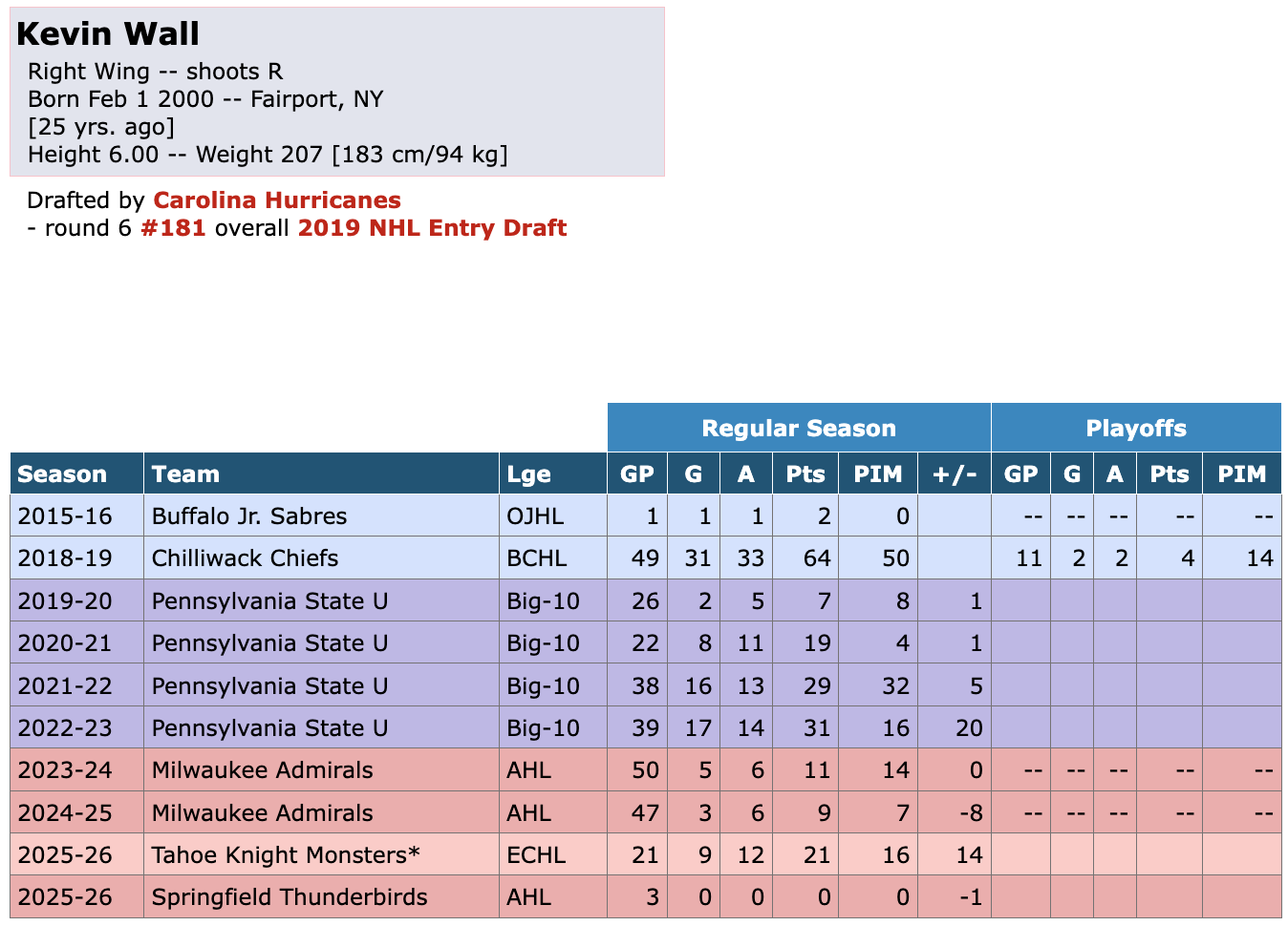 On Friday, December 5th, forward Kevin Wall was loaned from the Tahoe Knight Monsters to the Springfield Thunderbirds of the American Hockey League. He then signed a professional tryout (PTO) with Springfield. As of now, Wall appears to still be with the Thunderbirds. Prior to the loan, he appeared in 21 games for the Knight Monsters this season, recording 9 goals and 12 assists for 21 ECHL points. He also logged 16 penalty minutes and posted an impressive +14 +/- at the ECHL level.At the AHL level, Wall has played in 3 games this season with Springfield. He has yet to record a point, tallying 0 goals and 0 assists, along with no penalty minutes, and currently carries a -1 +/- rating.