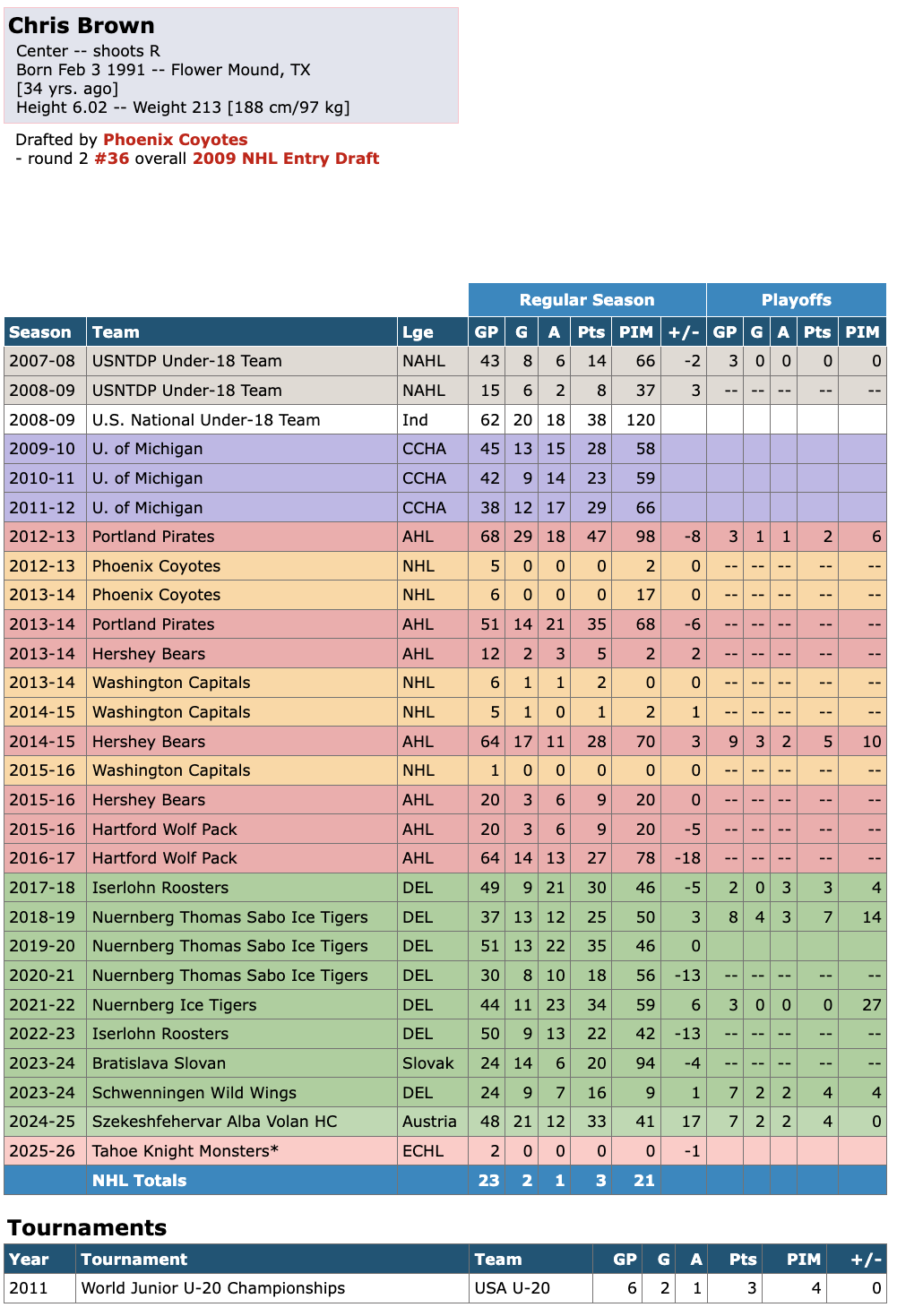 On Tuesday, December 9th, the Tahoe Knight Monsters signed forward Chris Brown. The 2025-26 season marked Brown’s 14th year of professional hockey. His career path includes junior experience in the NAHL, NCAA play at the University of Michigan, and being selected 36th overall by the Phoenix Coyotes in the 2009 NHL Draft. Brown brought an extensive professional résumé, with experience across the NHL, AHL, DEL (Germany), as well as leagues in Slovakia and Austria. Brown appeared in 2 games with the Knight Monsters, recording no goals or assists. He finished his brief stint with 0 penalty minutes and a -1 plus/minus rating before being released on Monday, December 15.