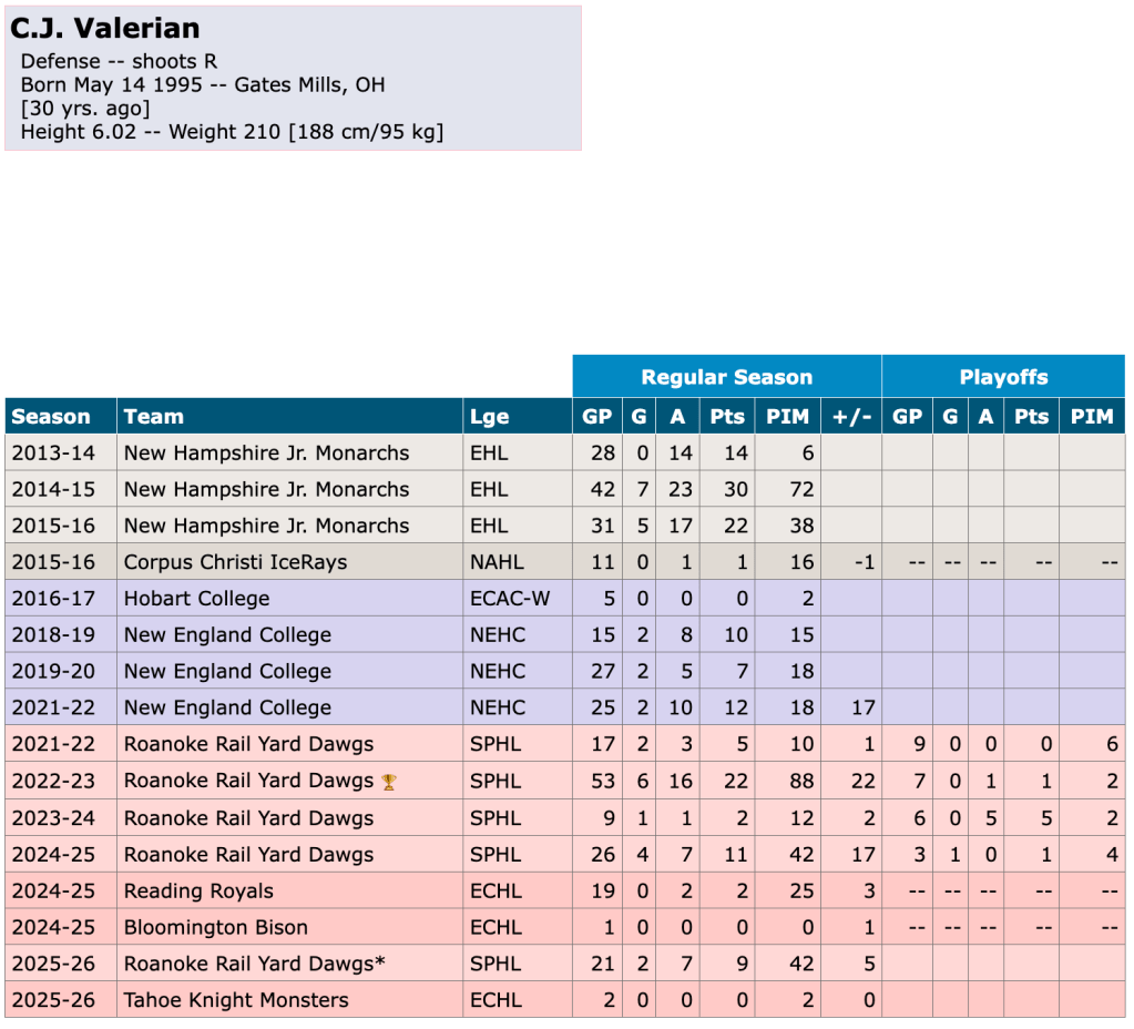 On Friday, December 19th, the Tahoe Knight Monsters signed defenseman C.J. Valerian. Valerian played junior hockey in the EHL and NAHL before continuing his career at the NCAA level with Hobart College and New England College. The 2025-26 season marks his sixth year of professional hockey, with previous experience in both the SPHL and ECHL. Valerian began the season in the SPHL with the Roanoke Rail Yard Dawgs, where he appeared in 21 games and recorded 2 goals and 7 assists for nine points. He also accumulated 42 penalty minutes and posted a +5 rating. Since joining the Knight Monsters, Valerian has played in 2 ECHL games, registering no points, 2 penalty minutes, and an even plus/minus rating.