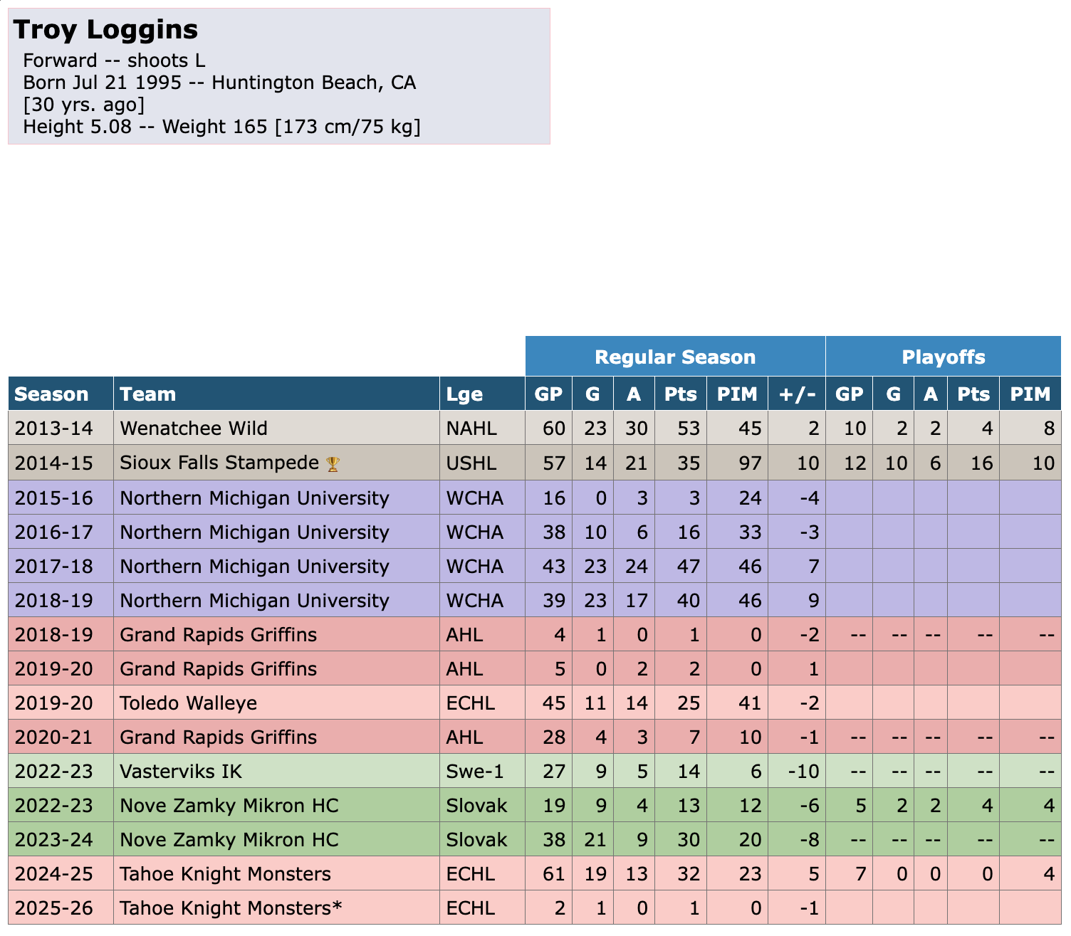 On Friday, December 19th, the Tahoe Knight Monsters signed forward Troy Loggins, bringing back a familiar face from last season. Loggins appeared in 61 games for the Knight Monsters during the 2024-25 campaign, and the current season marks his seventh year of professional hockey. His background includes junior experience in the NAHL and USHL, highlighted by a USHL championship with the Sioux Falls Stampede during the 2013-14 season. He followed that with an NCAA career at Northern Michigan University. Loggins professional résumé also includes time in the AHL, ECHL, as well as leagues in Sweden and Slovakia. Last season, Loggins recorded 19 goals and 13 assists for 32 points in 61 ECHL games, along with 23 penalty minutes and a +5 plus/minus rating. He also appeared in 7 playoff games, where he did not record a point but accumulated 4 penalty minutes. This season, Loggins played 2 games with the Knight Monsters, scoring 1 goal for 1 point with no penalty minutes and a -1 rating, before being released on Monday, December 22.
