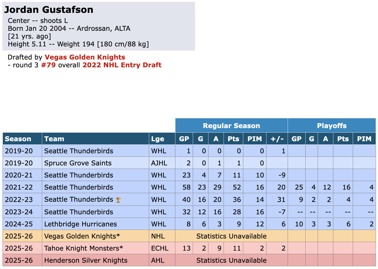 On Friday, December 26th, forward Jordan Gustafson was recalled from the Tahoe Knight Monsters to the Henderson Silver Knights. Gustafson appeared in 13 games with the Knight Monsters this season, recording 2 goals and 9 assists for 11 points. He also logged 2 penalty minutes and posted a +2 plus/minus rating at the ECHL level. Despite the call-up, Gustafson has yet to appear in a game at the AHL level this season.