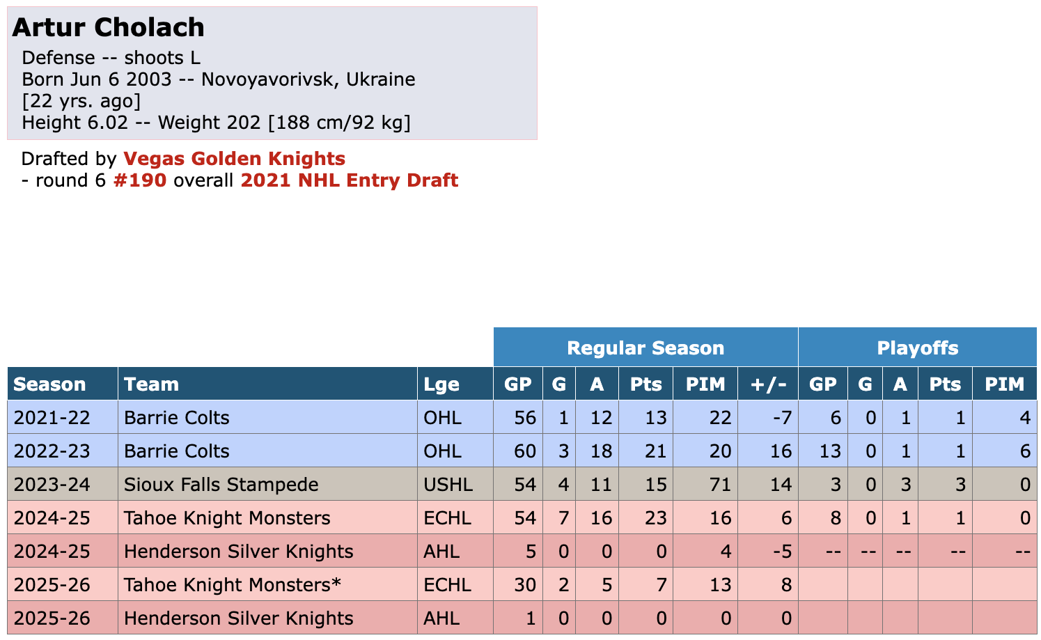 On Saturday, January 3rd, defender Artur Cholach was called up from the Tahoe Knight Monsters to the Henderson Silver Knights. He is in his second pro hockey season. He has played in 30 games this season with the Tahoe Knight Monsters. He has 2 goals and 5 assists for 7 total points in the ECHL this season. He has 13 penalty minutes and a +/- of +8 in the ECHL. He has played in one AHL game this season. He has 0 goals with 0 assists for 0 points in the AHL this season. He has 0 penalty minutes and a +/- of 0 in the AHL this season.