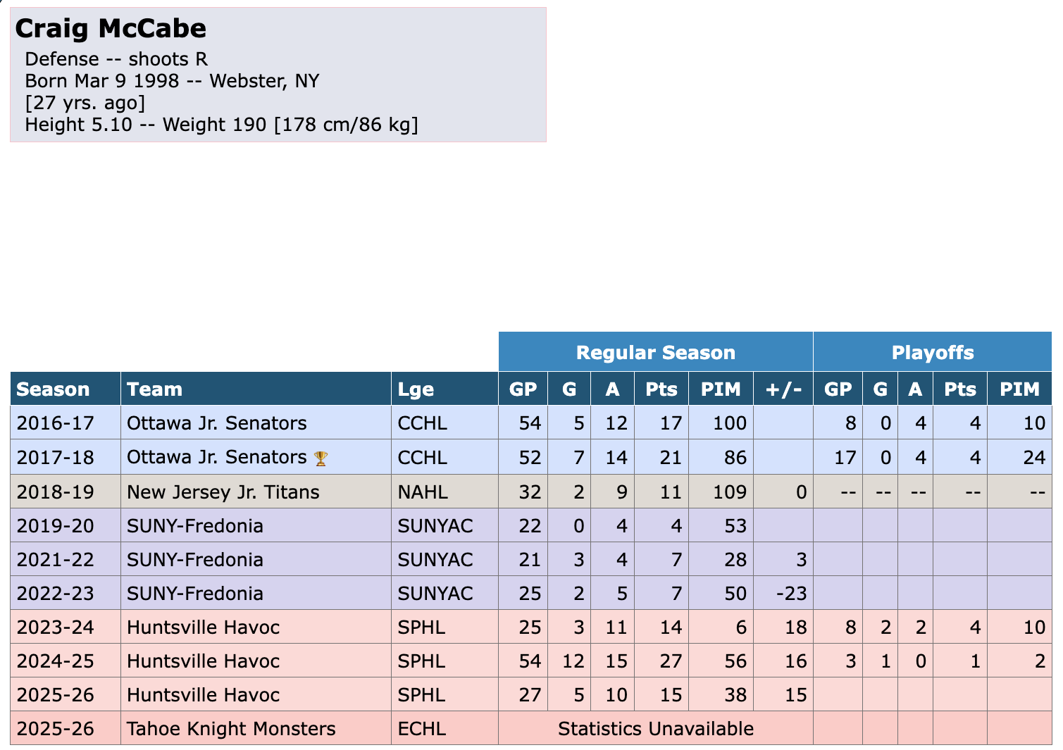 On Tuesday, January 8th, the Tahoe Knight Monsters signed defender Craig McCabe. He is in his third year of pro hockey. He played junior hockey in the CCHL and NAHL. He won a championship in the CCHL with the Ottawa Jr. Senators during the 2017-18 season. He played in the NCAA III for SUNY-Fredonia. His previous pro career includes the SPHL. He started this season with the Huntsville Havoc of the SPHL. He played 27 games this season in the SPHL. He scored 5 goals with 10 assists for 15 points in the SPHL. HE has 38 penalty minutes and a +/- of +15 this season in the SPHL.