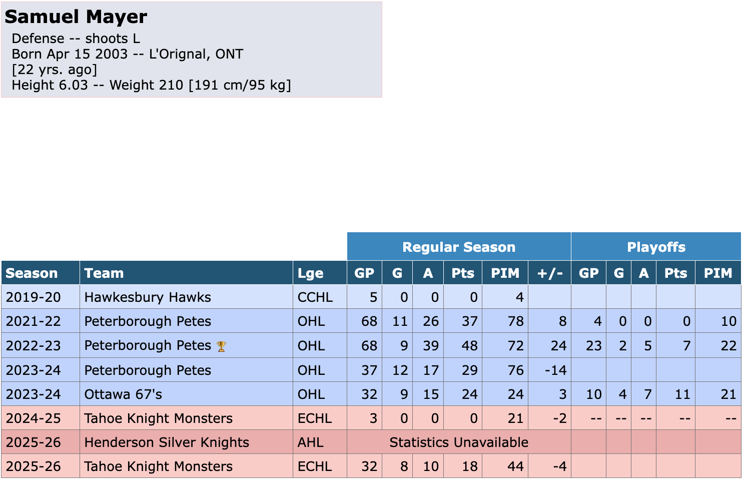 On Tuesday, January 6th, defender Amuel Mayer was called up from the Tahoe Knight Monsters to the Henderson Silver Knights. He has played 32 games with the Knight Monsters. He has scored 8 goals with 10 assists for 18 points this season. He has 44 penalty minutes with a +/- of -4. He has not played in an AHL game yet.