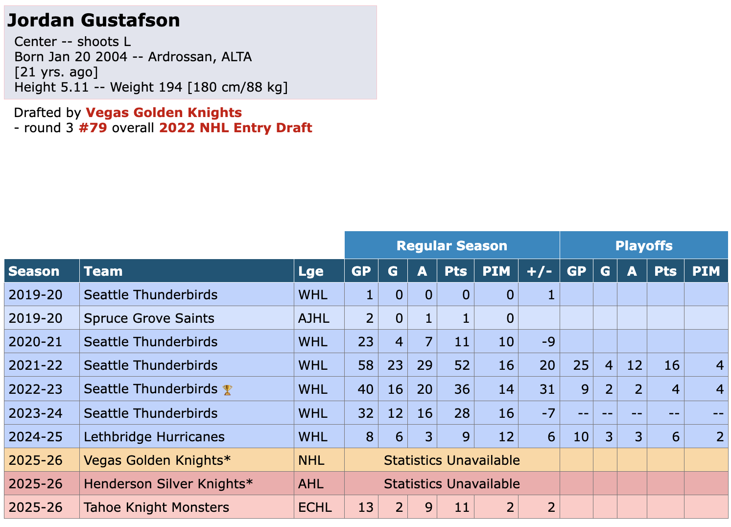 On Wednesday, January 7th, forward Jordan Gustafson was assigned from the Henderson Silver Knights to the Tahoe Knight Monsters. He did not play a game during his time in Henderson. He has played 13 games for the Tahoe Knight Monsters this season. He has 2 goals with 9 assists for 11 total points. He has 2 penalty minutes and +/- of +2 this season in the ECHL.