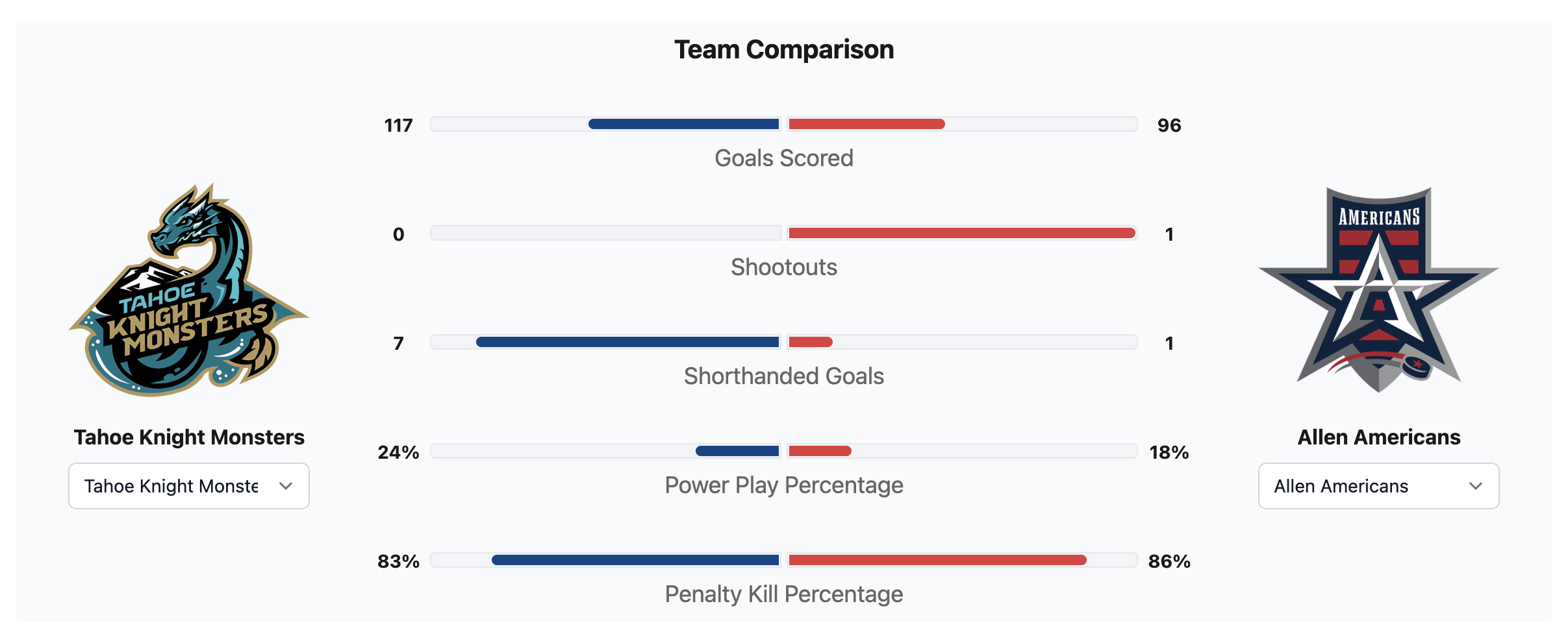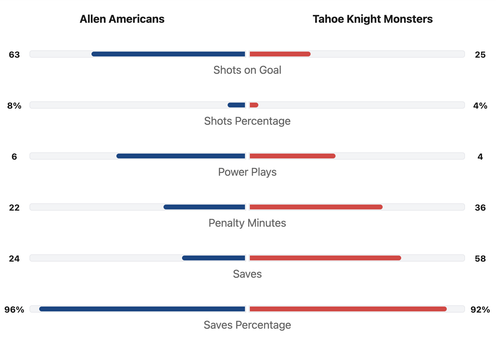 The Allen Americans had 38 more shots. The Tahoe Knight Monsters had 25 total shots. The Allen Americans had 63 total shots. The Americans had the better shot percentage. The Allen Americans had two more power plays. The Knight Monsters went 1 for 4 on the power play. The Americans went 1 for 6 on the power play. The Knight Monsters had 36 penalty minutes. The Americans had 22 penalty minutes. #39 Cameron Whitehead saved 58 of 64 shots for a 92% save percentage for Tahoe. #33 Marco Costantini saved 24 of 25 shots for a 96% save percentage for Allen.
