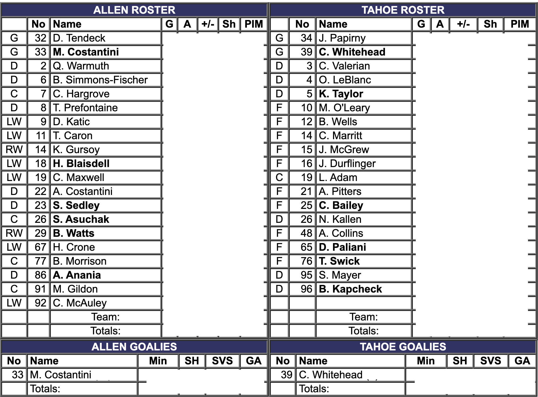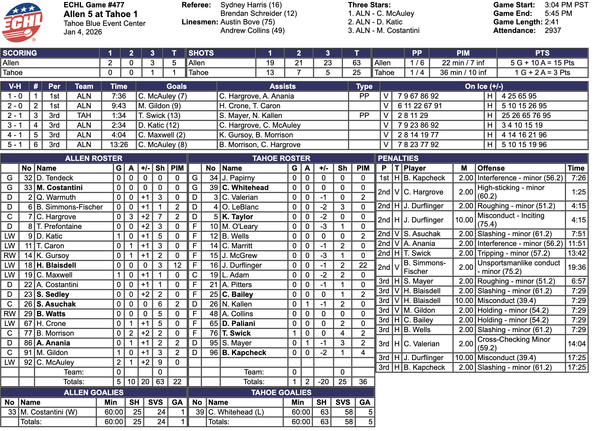 Six minutes into the game, Samuel Mayer of Tahoe was called for roughing. Seven minutes into the third period, Casey Bailey of Tahoe was called for holding, Blake Wells of Tahoe was called for slashing, Harrison Blaisdell of Allen was called for slashing and given a ten-minute misconduct, and Michael Gildon of Allen was called for holding. All five of those penalties were on the same play. With seven minutes left in the game, the Americans scored again. The goal was scored by #92 Colby McAuley and assisted by #77 Brad Morrison and #7 Colton Hargrove.