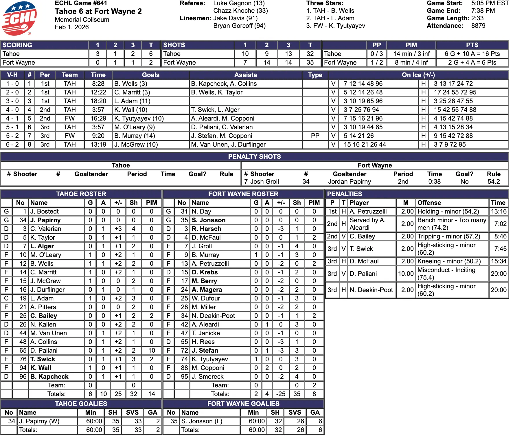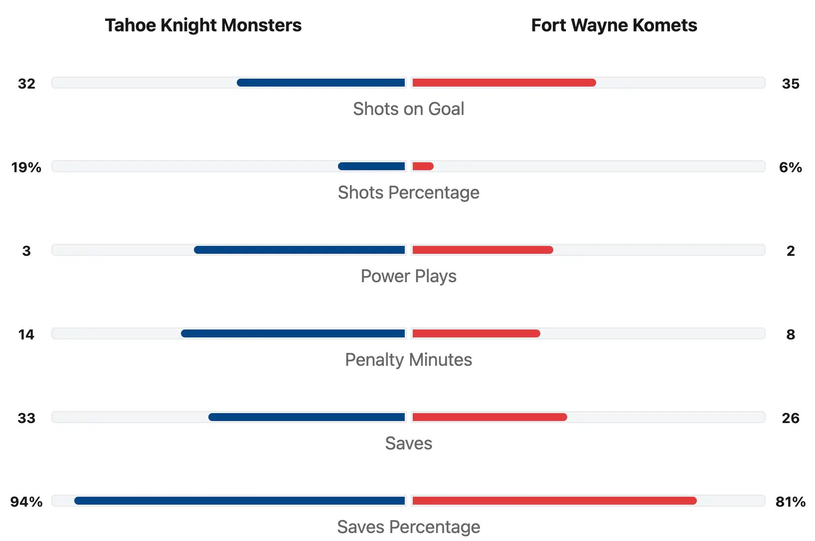 The Fort Wayne Komets had 3 more shots on goal. The Tahoe Knight Monsters had 32 total shots on goal. The Fort Wayne Komets had 35 total shots on goal. The Tahoe Knight Monsters had the better shots percentage. The Tahoe Knight Monsters had a 19% shots percentage. The Fort Wayne Komets had a 6% shots percentage. The Tahoe Knight Monsters had one more power play. The Tahoe Knight Monsters were 0-for-3 on the power play for 0%. The Fort Wayne Komets were 1-for-2 on the power play for 50%. The Tahoe Knight Monsters had 6 more penalty minutes. The Tahoe Knight Monsters had 14 total penalty minutes. The Fort Wayne Komets had 8 total penalty minutes. #34 Jordan Papirny saved 33 of 35 shots for a save percentage of 94% for Tahoe. #35 Samuel Jonsson saved 26 of 32 shots for a save percentage of 81% for the Fort Wayne Komets.