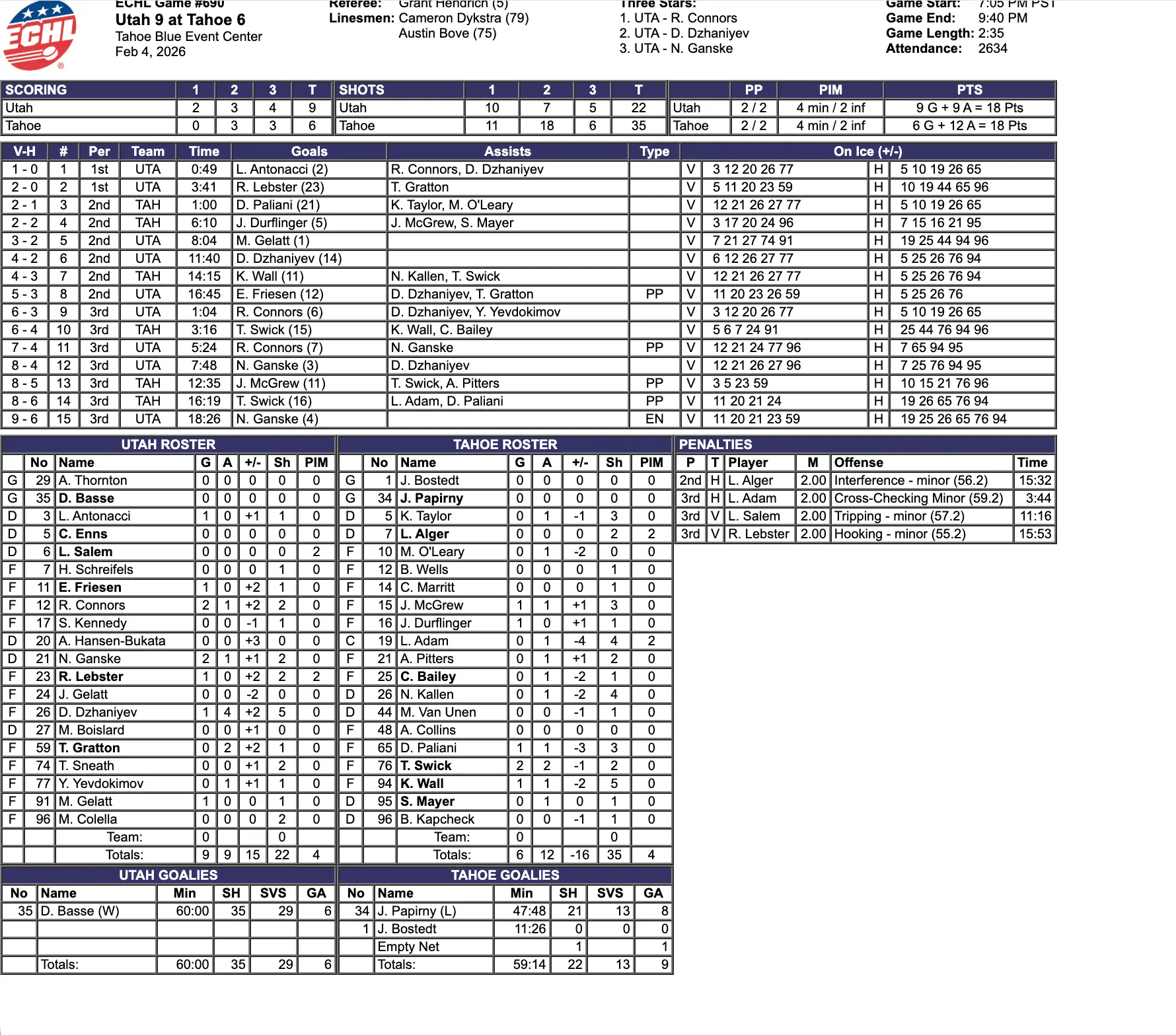 A minute into the third period, #12 Reilly Connors scored for the Utah Grizzlies. His goal was assisted by #26 Danny Dzhaniyev and #77 Yaroslav Yevdokimov. Three minutes into the third period, #76 Trent Swick scored for the Tahoe Knight Monsters. His goal was assisted by #94 Kevin Wall and #25 Casey Bailey. Then Luke Adam of Tahoe was called for cross-checking. On the power play the Grizzlies scored. The goal was scored by #12 Reilly Connors and assisted by #21 Noah Ganske. Tahoe switched goalies after this goal. Seven minutes into the third period, #21 Noah Ganske scored for the Grizzlies. His goal was assisted by #26 Danny Dzhaniyev. With under nine minutes left Luc Salem of Utah was called for tripping. On the power play, #15 Jake McGrew scored for Tahoe assisted by #76 Trent Swick and #21 Adam Pitters. With under five minutes left in the game, Reed Lebster of Utah was called for hooking. On the power play, #76 Trent Swick scored for the Knight Monsters.His goal was assisted by #19 Luke Adam and #65 Devon Paliani. With under two minutes left, #21 Noah Ganske scored an empty net goal for the Grizzlies. The final score was 9-6, Utah Grizzlies.