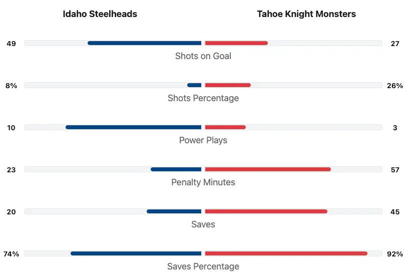 The Tahoe Golden Monsters scored two goals. The Idaho Steelheads also scored two goals. The Tahoe Golden Monsters had a 5-3 lead going into the third period.