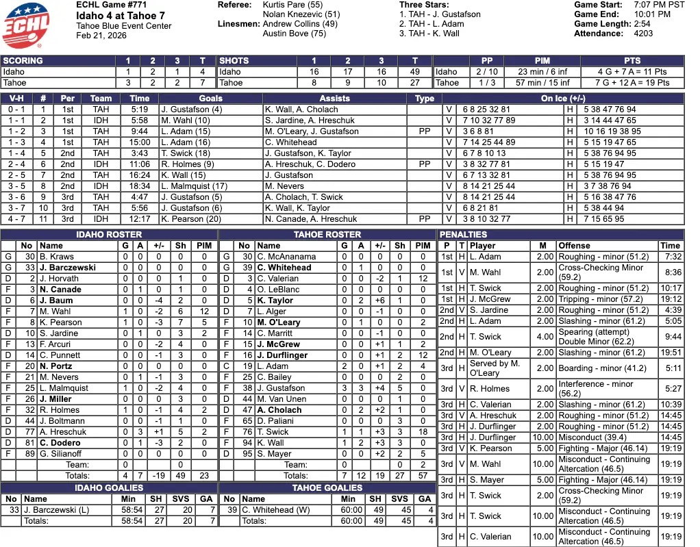 The Idaho Steelheads got another goal in the third period. The Tahoe Golden Monsters scored two more in the third period. Jordan Gustafson of Tahoe completed a hat trick with two goals in the third period. The final score was 7-4, Tahoe Golden Monsters.