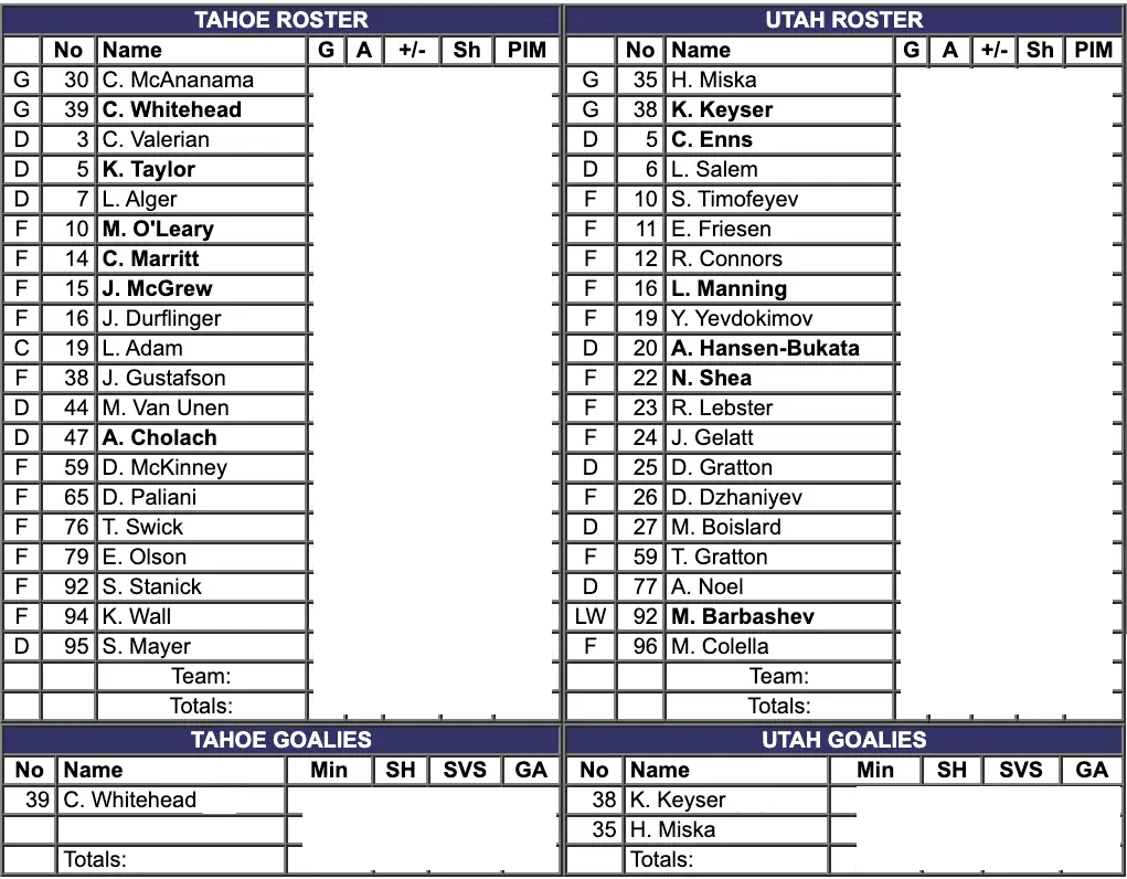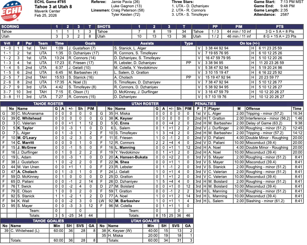 Utah scored their eighth goal of the game less than thirty seconds later. Reilly Connors scored the goal. His goal was assisted by Danny Dzhaniyev. Eight minutes into the third period, Sloan Stanick of Tahoe was called for roughing, C.J. Valerian of Tahoe was called for roughing and given a misconduct, Mathieu Boislard of Utah was called for roughing and given a misconduct, Luke Manning of Utah was called for roughing and given a misconduct, Luc Salem of Utah was given a penalty for slashing, and Samuel Mayer of Tahoe was called for roughing and given a misconduct. Lots of penalties in one play. The final score was 8-3, Utah Grizzlies.